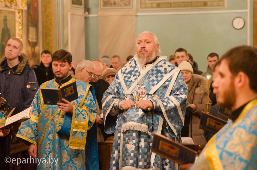 7 декабря 2014г. Преосвященнейший Стефан возглавил вечернее богослужение с пением акафиста Пресвятой Богородице в Свято-Петро-Павловском кафедральном соборе г.Гомеля. Преосвященнейшему сослужили: секретарь Гомельской епархии протоиерей Георгий Алампиев, ключарь Свято-Петро-Павловского кафедрального собора г.Гомеля протоиерей Андрей Шихалов и духовенство епархии. По окончании богослужения со словами проповеди ко всем молящимся обратился клирик храма св.блг.кн.Александра Невского иерей Георгий Яковцев. |