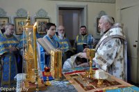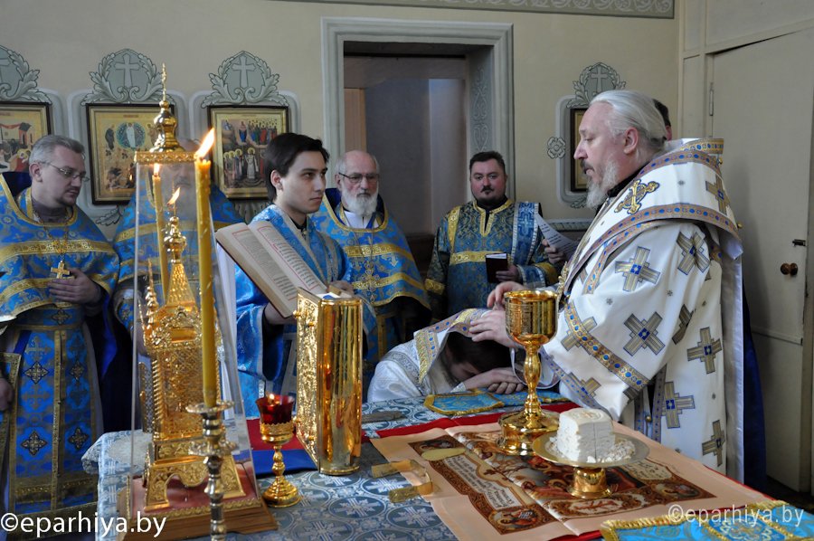 25 февраля 2014г. Преосвященнейший Стефан, епископ Гомельский и Жлобинский, в престольный праздник возглавил Божественную Литургию в храме Иверской иконы Божией Матери г. Гомеля За богослужением Преосвященейшему сослужили: секретарь Гомельской епархии протоиерей Георгий Алампиев, благочинный Гомельского городского округа протоиерей Стефан Гладыщук, настоятель храма протоиерей Георгий Тур и духовенство храма. По благословению Преосвященнейшего Стефана, епископа Гомельского и Жлобинского, во диаконы был рукоположен пономарь храма Иверской иконы Божией Матери Алексей Сергеев. Диакон Алексей в регулярно посещает церковь с семи лет, с 12-ти является пономарем храма Иверской иконы Божией Матери. Окончил БелГУТ, сейчас обучается на третьем курсе Киевской семинарии. |