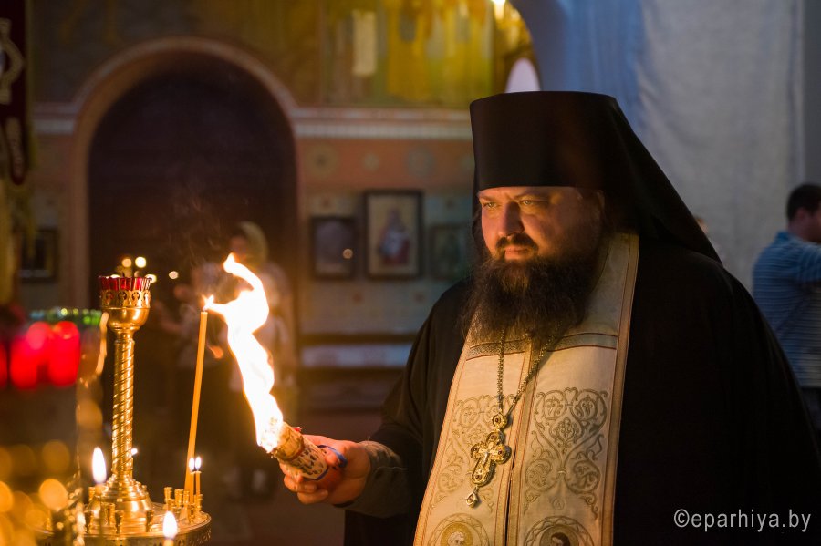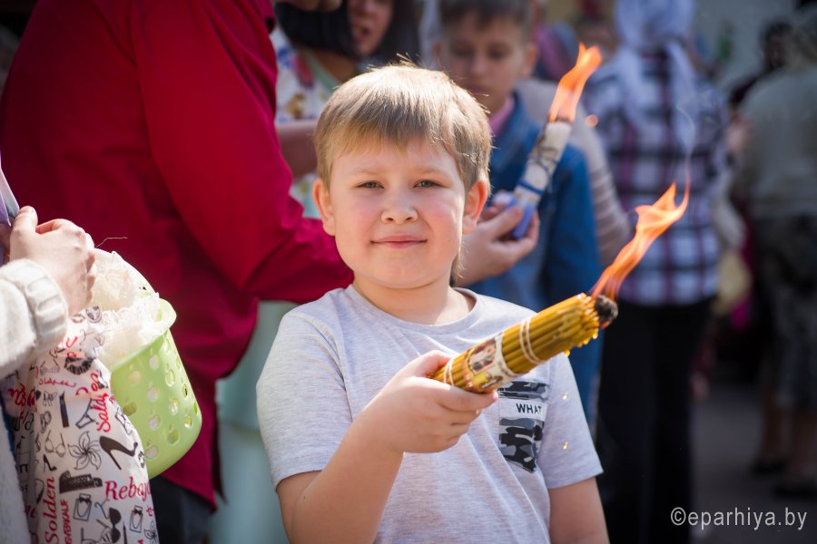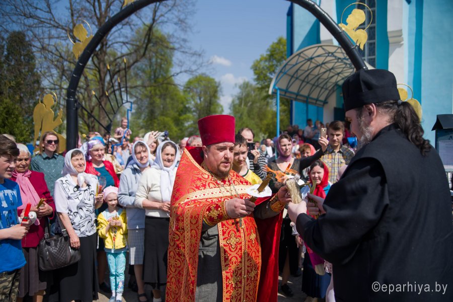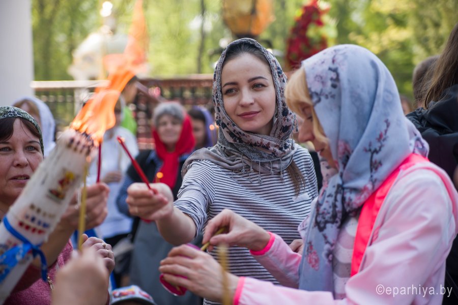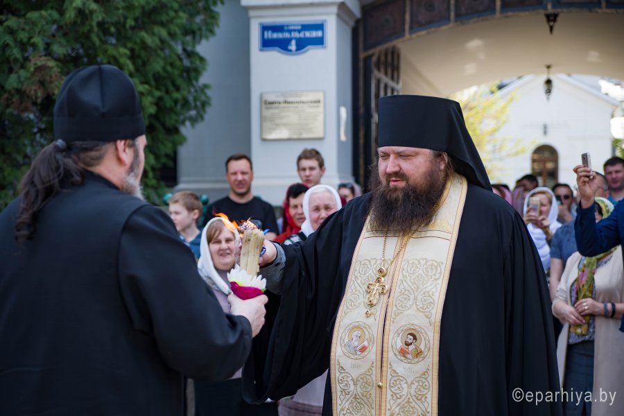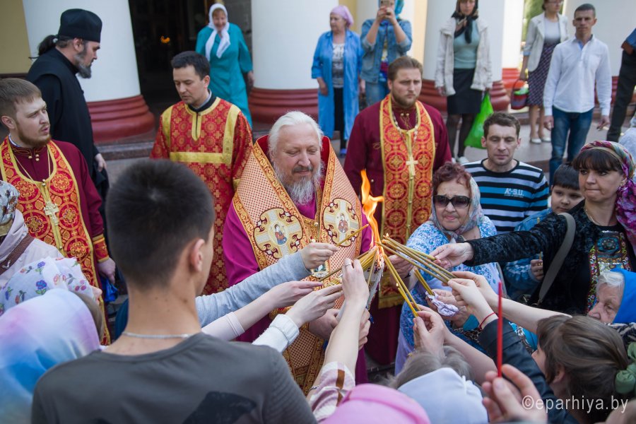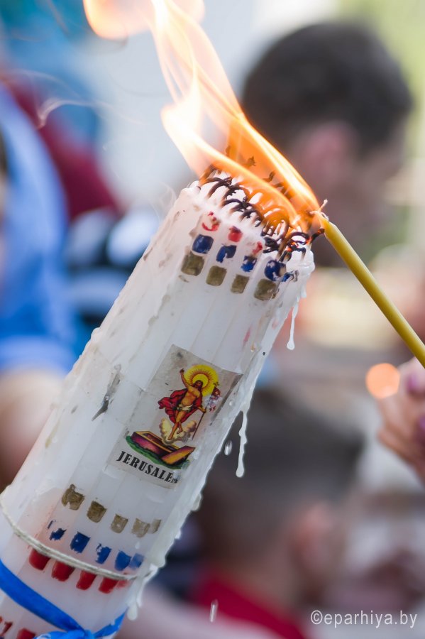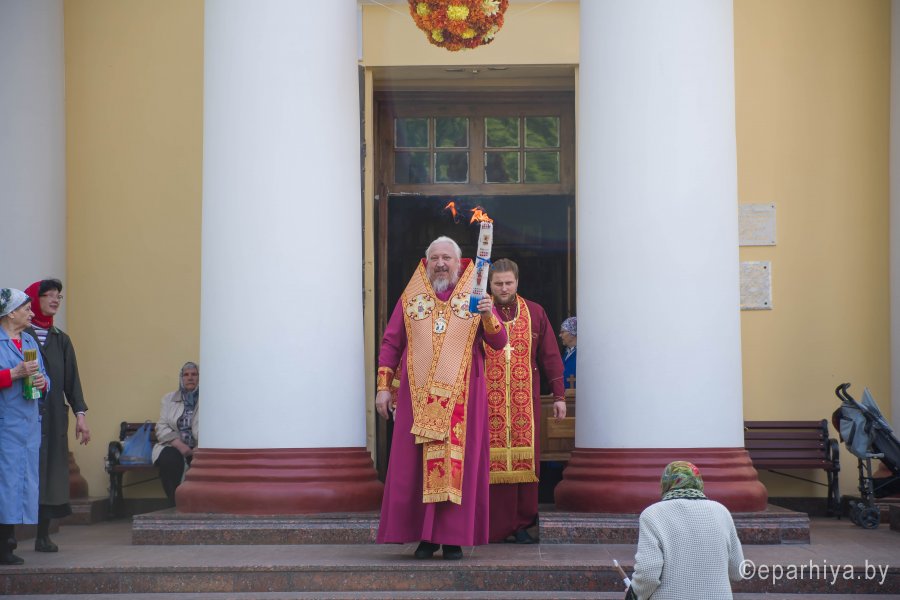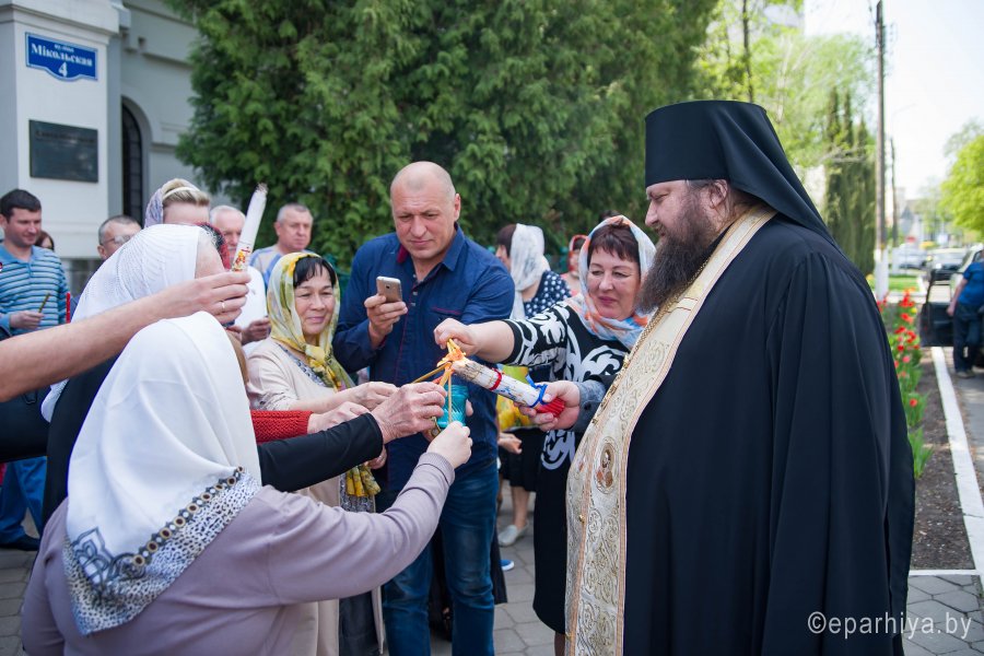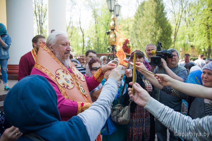 В Пасхальную ночь с 27 на 28 апреля в Гомельскую епархию из Иерусалима прибыл благодатный огонь. Утром, в праздник Светлого Христова Воскресения, он отправился с крестным ходом по храмам города. Пасхальный огонь, который символизирует воскресшего Христа, сопровождала в пути звонница Спасо-Преображенского храма. Шествие началось от кафедрального Свято-Петро-Павловского собора. Высокопреосвященнейший Стефан, архиепископ Гомельский и Жлобинский на ступеньках собора передал Благодатный огонь. Во время Крестного хода со святыней переливчатый звон колоколов разносил благую весть о Воскресении Господнем, заполняя радостью улицы и сердца людей. У храмов Благодатный Огонь встречали священнослужители и многочисленные прихожане. |