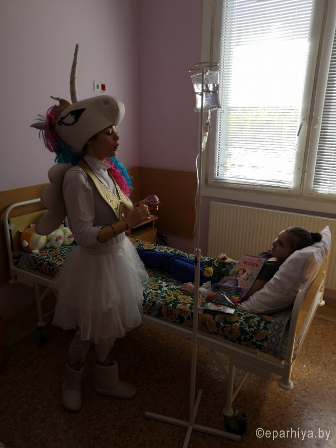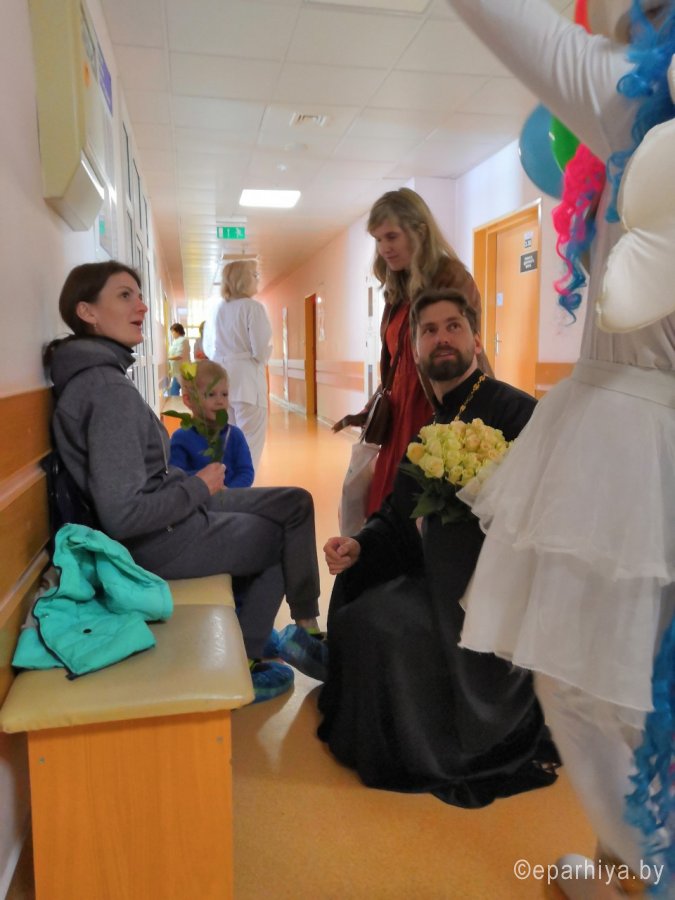 Совместная благотворительная акция состоялась в Гематологическом отделении для детей Республиканского научно-практического центра радиационной медицины и экологии человека к Светлому празднику Христова Воскресения. 30 апреля клирик храма святого Архангела Михаила иерей Максим Новик и клирик храма святой Живоначальной Троицы в г. Гомеле протоиерей Николай Кадацкий поздравили детей и их родителей с Пасхой, а также вручили иконки, пасхальные яйца, сладкие подарки, наборы для рисования. Создавали хорошее настроение аниматоры Детского праздника "KERRY SHOW". Ставшие уже доброй традицией, совместные акции храмов помогают детям, находящимся на длительном лечении в отделении, скрасить больничные будни. |