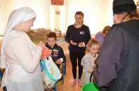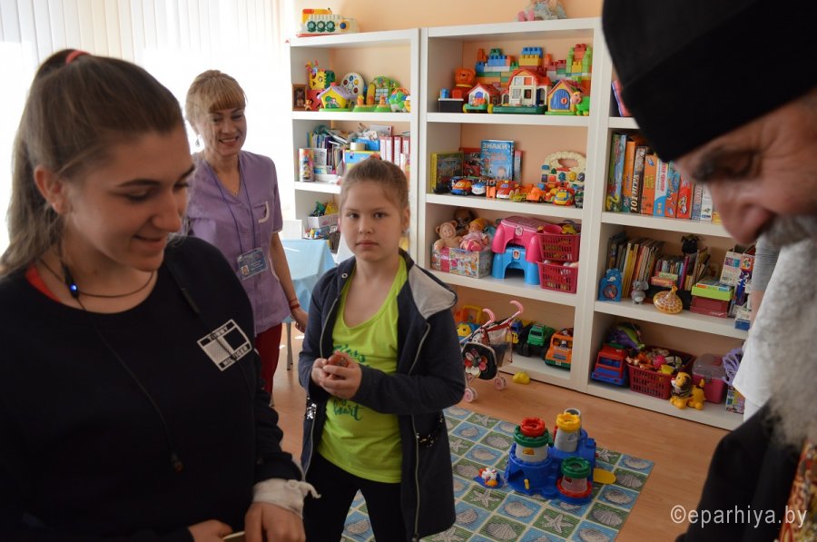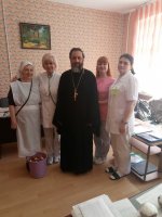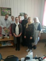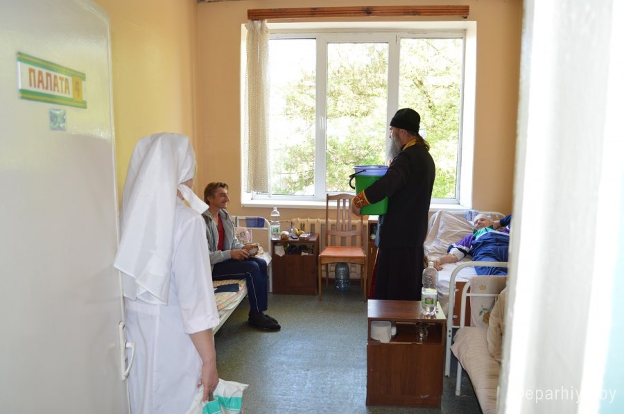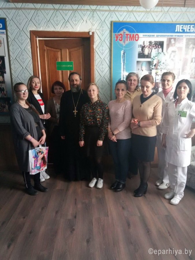30 апреля 2019 г., в рамках проводимой в Гомельской епархии акции "Кулич в ладошку", настоятель храма Покрова Пресвятой Богородицы в г. Речице протоиерей Николай Ефименко и клирик Успенского собора в г. Речице иерей Николай Савостьянов поздравили с праздником Пасхи пациентов УЗ «Речицкая ЦРБ». Совместно с сестрами милосердия из православного сестричества в честь святой мученицы Татианы и волонтерами из учреждений образования "Речицкий государственный аграрный колледж" и "Речицкий государственный педагогический колледж" священнослужители поздравили со Светлым Христовым Воскресением медицинский персонал и находящихся на лечении в отделениях больницы людей. Всем были вручены куличи, яйца, поздравительные открытки и пасхальные подарки. |