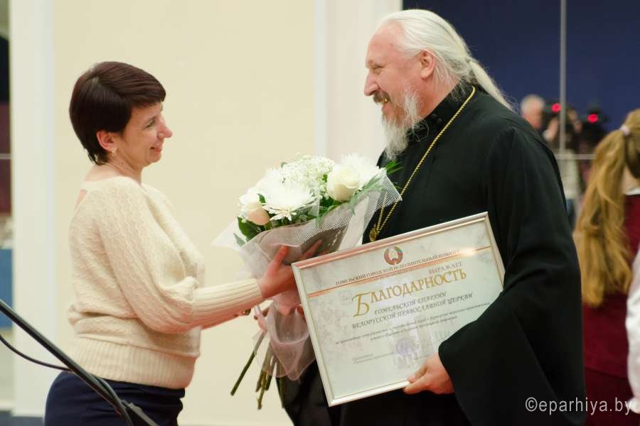 15 мая 2015г., в Гомельском городском Центре Культуры состоялось торжественное закрытие XII Пасхального фестиваля. Преосвященнейший Стефан, епископ Гомельский и Жлобинский, приветствовал собравшихся в зале, тепло и сердечно благодарил отдел идеологии, образования и культуры Гомельского Горисполкома за неизменно проявляемый интерес к православному празднику - Светлому Христову Воскресению и содействие в проведении - XII Пасхального фестиваля, поддержание, развитие и укрепление национальных традиций на основе общечеловеческих и христианских ценностей, тесное сотрудничество в деле духовно-нравственного воспитания сограждан на благо г.Гомеля и региона в целом. Преосвященнейший Стефан, в лице Руденок Оксаны Константиновны, поблагодарил за плодотворное сотрудничество председателя Гомельского горисполкома Петра Кириченко и подчеркнул, что на прошедшем Пасхальном фестивале приняли участие 10 тысяч активных участников и более 150 тысяч тех, кого комплекс мероприятий также тем или иным образом коснулся. В ходе Пасхального фестиваля проходили ознакомительные, паломнические поездки и экскурсии к культурно-историческим памятникам и православным святыням Гомеля, циклы книжно-иллюстративных выставок в библиотеках, различные благотворительные акции. Состоятся многочисленные мероприятия и в учреждениях образования. Проводились встречи священнослужителей с учащейся молодежью, организованы семинары и круглые столы, концертные программы. Заместитель председателя Гомельского горисполкома по социальным вопросам Оксана Руденок вручила благодарности наиболее активным участникам и организаторам многочисленных мероприятий, которые на протяжении нескольких недель проходили в детских садах, школах, высших учебных заведениях, учреждениях культуры. В пасхальные дни творились дела милосердия и благотворительности, проводились выставки, концерты, конкурсы. Вниманием были окружены дети, оставшиеся без попечения родителей, дети-инвалиды, старики, одинокие и немощные люди, многодетные семьи и многие другие социальные слои сограждан, нуждающихся в заботе. |