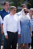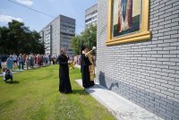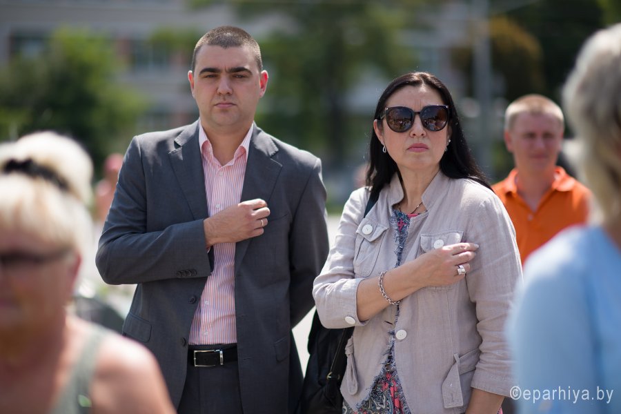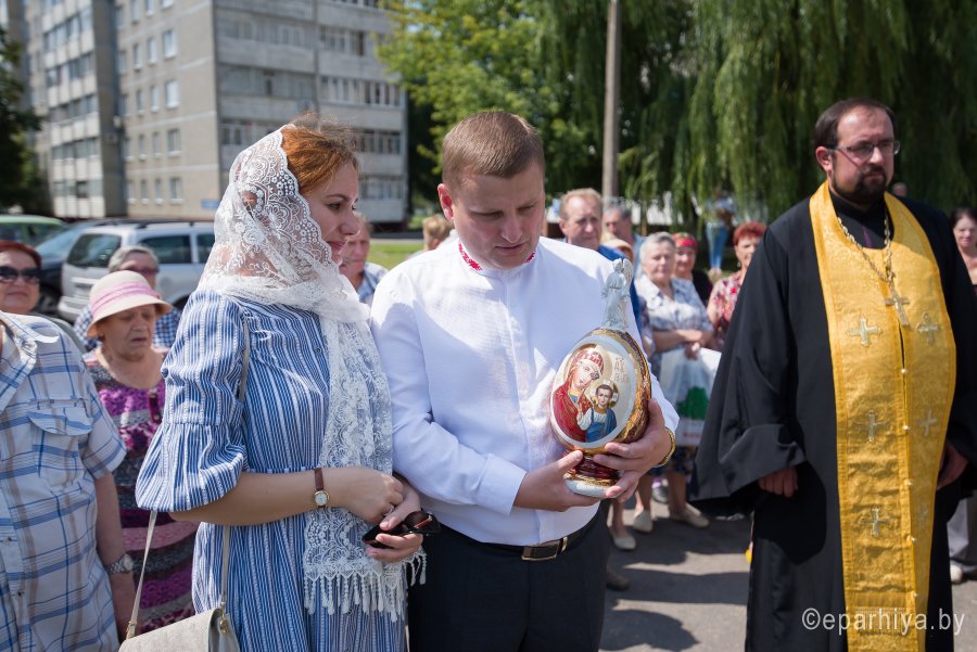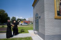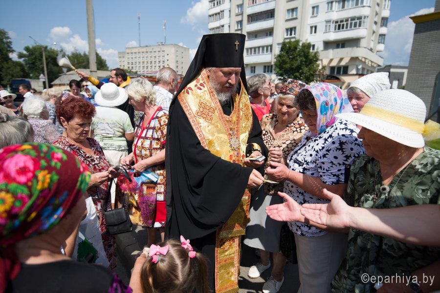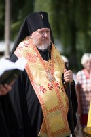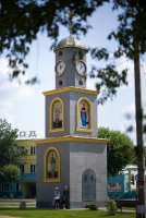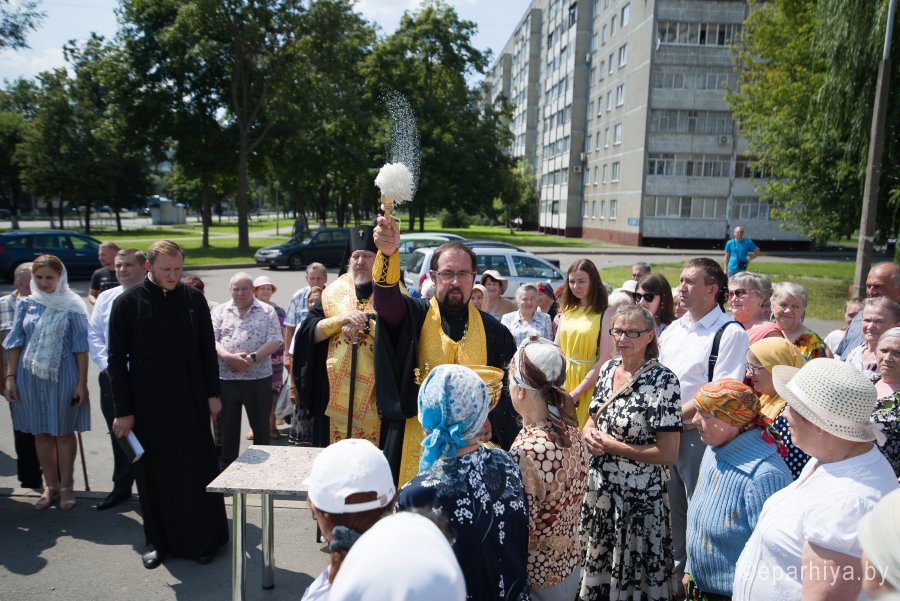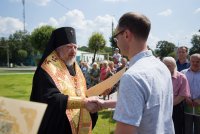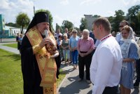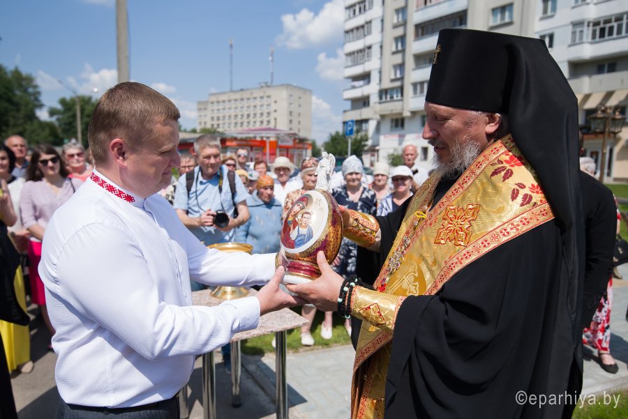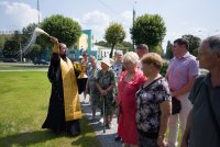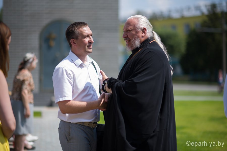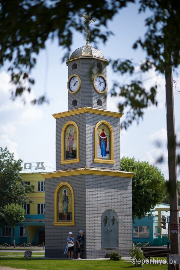 Высокопреосвященнейший Стефан в сослужении благочинного Гомельского городского округа протоиерея Игоря Ольшанова 21 июля 2019 года совершил освящение часозвони «Благовест», построенной силами ОАО «Гомельский мотороремонтный завод». Первые два яруса башни с часами украшены панно с изображением местночтимых святых, на третьем ярусе установлены четыре циферблата. Владыка поблагодарил всех, принимавших участие в строительстве, за огромный вклад в духовное развитие нашего города, а также вручил директору завода Коробач А. А. памятный подарок. Особо потрудившихся в строительстве работников Высокопреосвященнейший Стефан наградил медалью праведного Иоанна Кормянского и Архиерейскими грамотами. После чина освящения Владыка Стефан раздал присутствующим на молитвенную память иконки. |