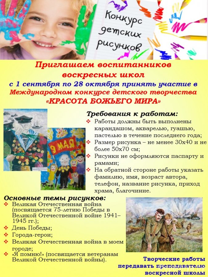 Принимая во внимание необходимость поддержки творческих инициатив подрастающего поколения, а также педагогов и воспитателей, содействующих духовно-нравственному развитию личности ребёнка, по благословению Святейшего Патриарха Московского и всея Руси КИРИЛЛА в 2019 году организуется Международный конкурс детского творчества «Красота Божьего мира». Номинации Конкурса в 2019 году: «ОСНОВНАЯ ТЕМАТИКА»: