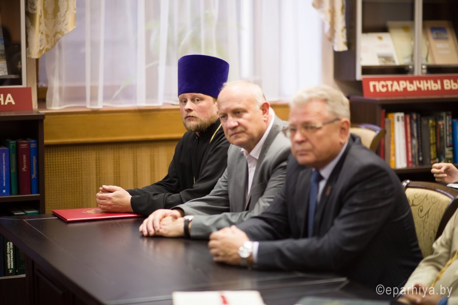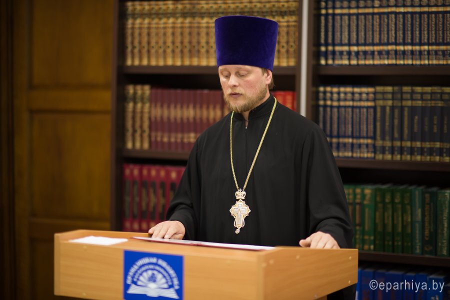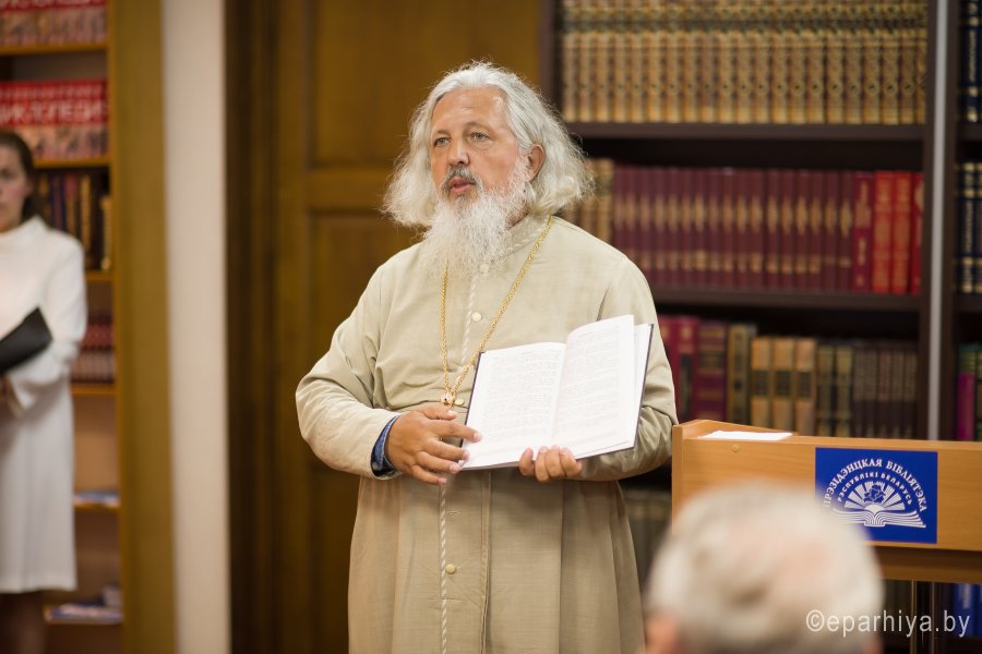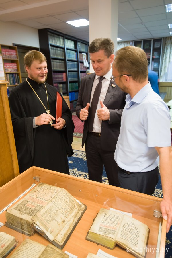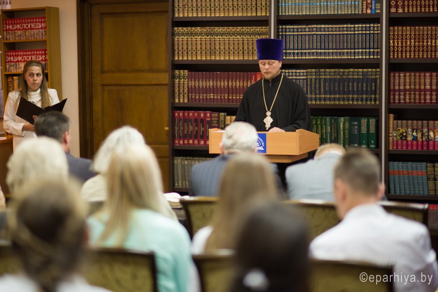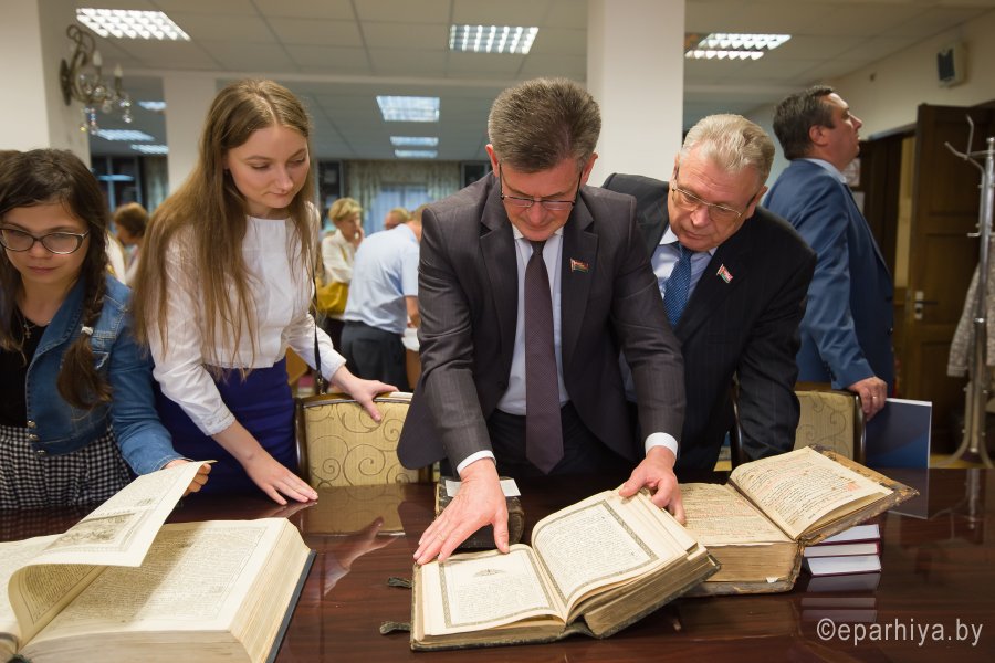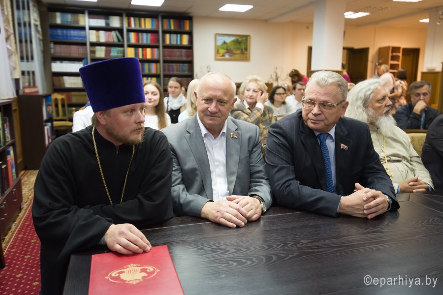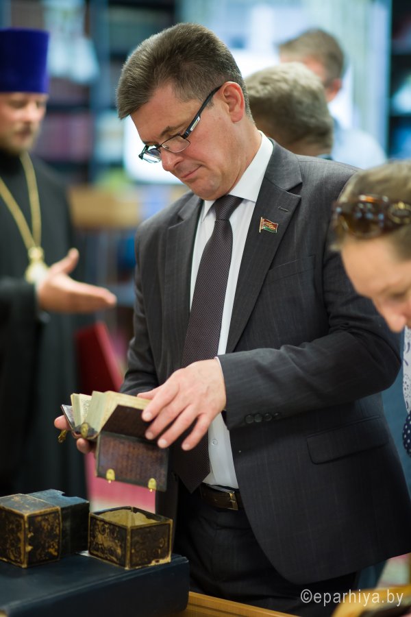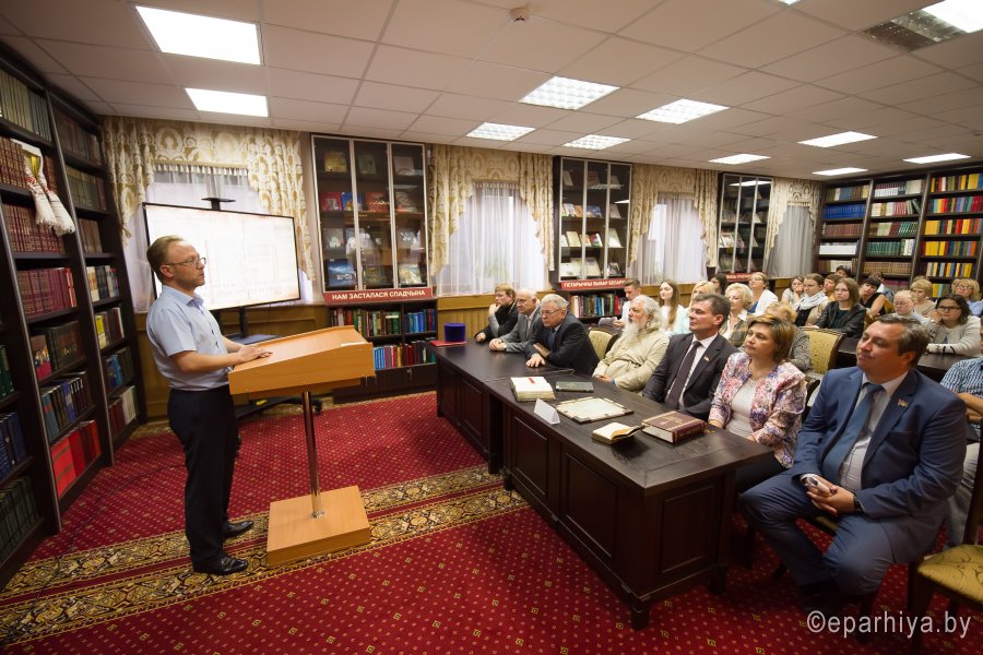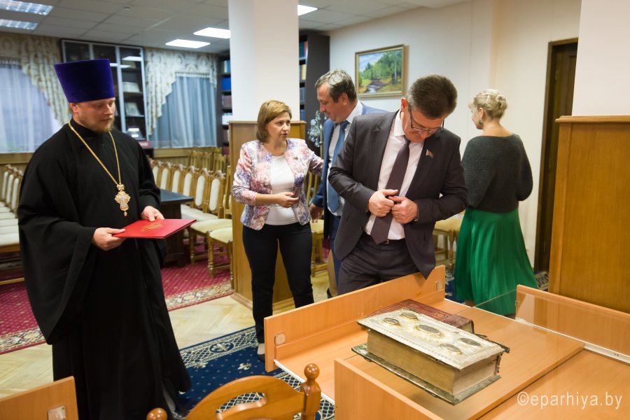 В рамках мероприятий, приуроченных к знаковому событию в культурной жизни нашей страны – Дню белорусской письменности – в Президентской библиотеке Республики Беларусь состоялось открытие книжной выставки «Духовных книг божественная мудрость: к истокам белорусской книги». В открытии выставки приняли участие секретарь Гомельской епархии протоиерей Георгий Алампиев и заведующий канцелярией епархии Черняков Василий Владимирович. На выставке представлено более двадцати кириллических старопечатных изданий XVII-XVIII веков, такие как «Служебник» (1601), «Aнфологион» (1619), «Триодион» (1664), «Псалтырь» (1737), редкие и уникальные издания «Нового Завета» из фондов Президентской библиотеки Республики Беларусь, Историко-археологического кабинета Гомельской епархии и Музея Библии Института теологии имени святых Мефодия и Кирилла Белорусского государственного университета. Приветственный адрес участникам мероприятия направил министр информации Республики Беларусь А.Н. Карлюкевич, отметив, что книга со времен Евфросиньи Полоцкой и Кирилла Туровского всегда была для белорусов животворным родником и надежным фундаментом национального развития. Особо подчеркивалось, что сегодня государство активно поддерживает национальное информационное пространство, отечественное книгоиздание с целью консолидации общества и утверждения высоких моральных ценностей и идеалов. Приветственный адрес от правящего архиерея Гомельской епархии архиепископа Гомельского и Жлобинского Стефана зачитал секретарь Гомельской епархии протоиерей Георгий Алампиев. В нем говорится, что «…выставка «Духовных книг божественная мудрость: к истокам белорусской книги» есть ещё одно свидетельство доброго соработничества государства и Церкви в нашей стране на ниве сбережения богатого историко-культурного и духовного наследия нашего народа. <…> Открывая эту выставку, мы свидетельствуем о значимости книги и чтения в современном обществе и понимании этого на государственном уровне».Среди гостей мероприятия были представители Белорусской православной церкви, депутаты Палаты представителей Национального собрания Республики Беларусь, студенты «Института теологии имени святых Мефодия и Кирилла» Белорусского государственного университета, исследователи литературы. С приветственными словами выступили депутаты Палаты представителей Национального собрания Республики Беларусь Евгений Буниславович Адаменко и Олег Федорович Левшунов. Об особенностях кириллических старопечатных изданий XVII-XVIII веков и переводе книг Священного Писания на современный белорусский язык рассказал первый проректор «Института теологии имени святых Мефодия и Кирилла» Белорусского государственного университета, лауреат премии Президента Республики Беларусь «За духовное возрождение» протоиерей Сергий Гордун. Интересными фактами об уникальных экспонатах Историко-археологического кабинета поделился с присутствующими заведующий канцелярией Гомельской епархии Василий Владимирович Черняков. Среди гостей мероприятия было немало людей, которые не только сохраняют и исследуют памятники кириллического книгопечатания, но и работают над их возвращением читателю. О проекте «Музей Библии» Института теологии имени святых Мефодия и Кирилла Белорусского государственного универ