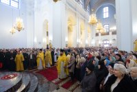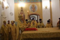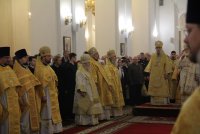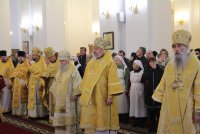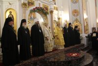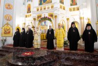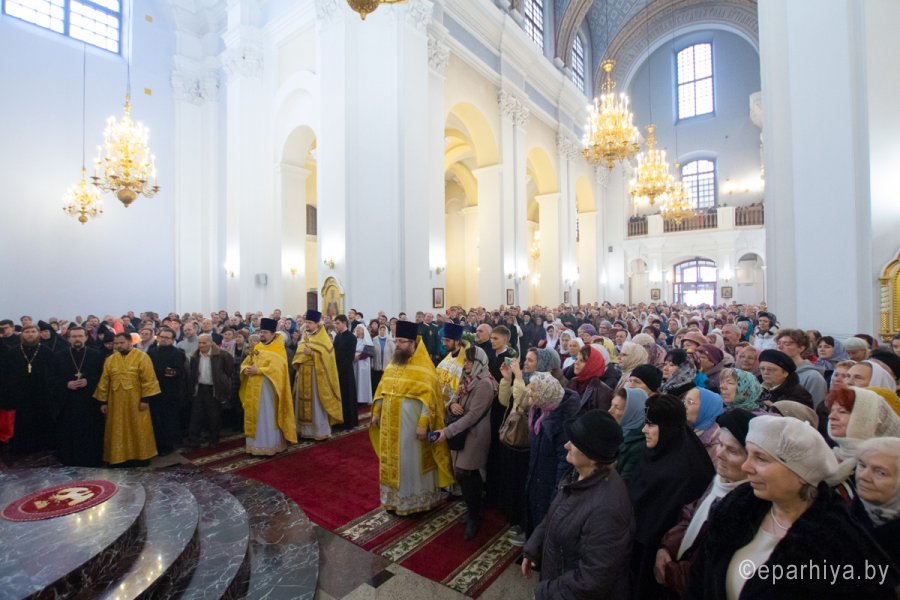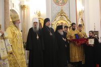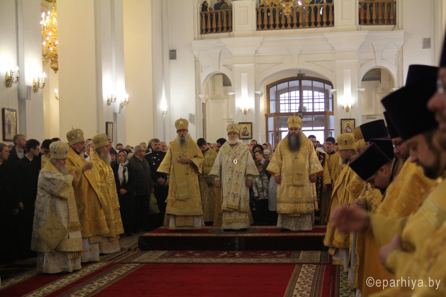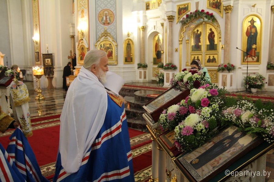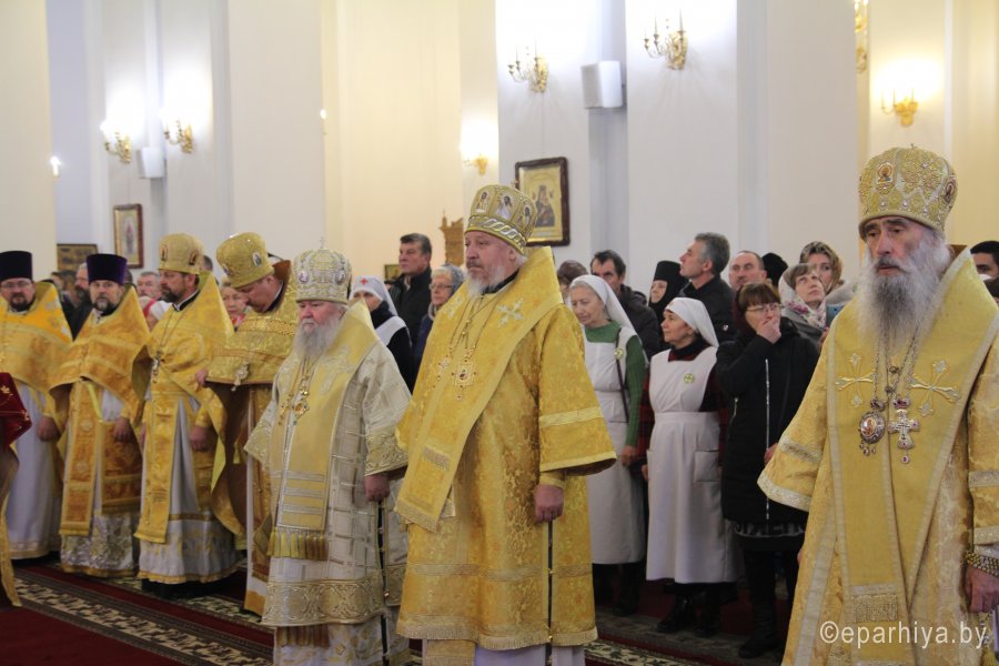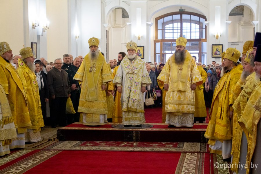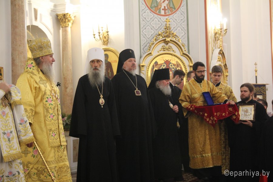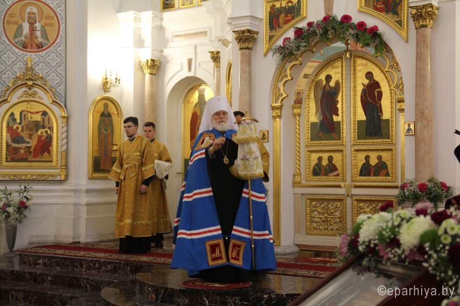 10 ноября 2019 года, в Неделю 21-ю по Пятидесятнице, день памяти святителя Димитрия, митрополита Ростовского, митрополит Минский и Заславский Павел, Патриарший Экзарх всея Беларуси, совершил Божественную литургию в Свято-Успенском кафедральном соборе города Витебска. Торжественное богослужение было приурочено к 30-летию восстановления Витебской кафедры. Патриаршему Экзарху сослужили: митрополит Тернопольский и Кременецкий Сергий; митрополит Нижегородский и Арзамасский Георгий; архиепископ Витебский и Оршанский Димитрий; архиепископ Могилевский и Мстиславский Софроний; архиепископ Гомельский и Жлобинский Стефан; епископ Туровский и Мозырский Леонид; епископ Великолукский и Невельский Сергий и епископ Борисовский и Марьиногорский Вениамин. На богослужении присутствовали: заместитель председателя Витебского областного исполнительного комитета Владимир Петрович Пенин, главный специалист отдела по делам молодежи, религий и национальностей Главного управления идеологической работы, культуры и по делам молодежи Витебского облисполкома Сергей Николаевич Фадеенков и другие высокие гости. Проповедь по запричастном стихе произнес протоиерей Александр Сироткин. Богослужебные песнопения исполнили сводный хор под управлением Ольги Янченко и хор Витебской духовной семинарии под управлением диакона Александра Буханцова. По заамвонной молитве архиереи и сослужившие священнослужители совершили славление святителю Димитрию Ростовскому. По окончании богослужения заместитель председателя Витебского областного исполнительного комитета Владимир Петрович Пенин огласил поздравительный адрес от лица региональной власти по случаю 30-летия восстановления Витебской кафедры и 30-летия архиерейской хиротонии архиепископа Витебского и Оршанского Димитрия. Митрополит Минский и Заславский Павел также поздравил владыку Димитрия от лица духовенства и мирян с 30-летием епископской хиротонии и с днем небесного покровителя, пожелав юбиляру крепости сил духовных и телесных на дальнейшем пути служения святой Церкви Христовой. Также владыка Экзарх поздравил архиепископа Димитрия с 30-летием возрождения епископской кафедры на Витебской земле и вручил ему архиерейскую панагию с памятной надписью. Владыка Павел обратился ко всем присутствующим со словом назидания, а затем поздравил причастников с принятием Святых Христовых Таин и преподал всем архипастырское благословение. Всем почтившим праздник были вручены иконки Божией Матери «Жировичская». По материалам сайта church.by |