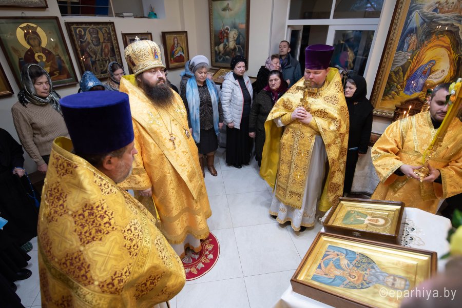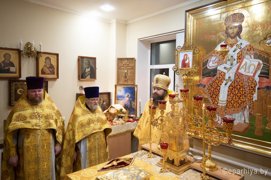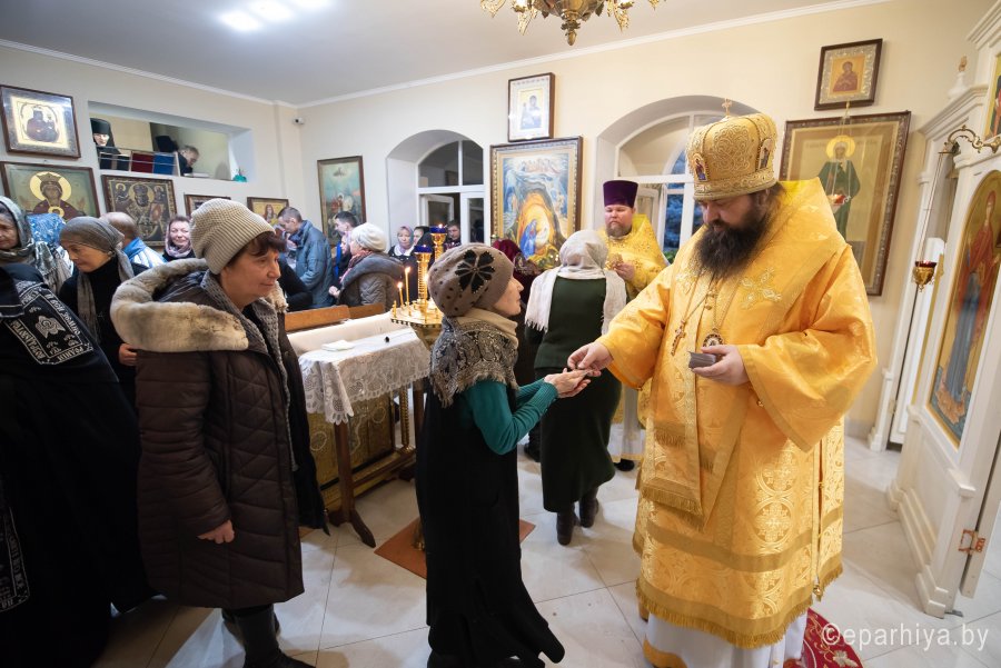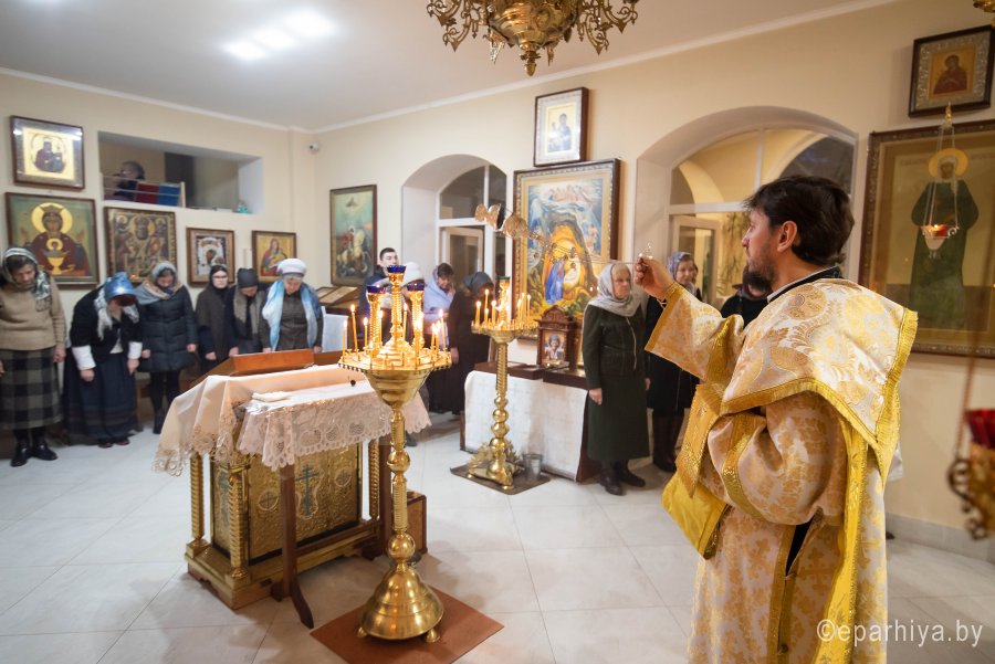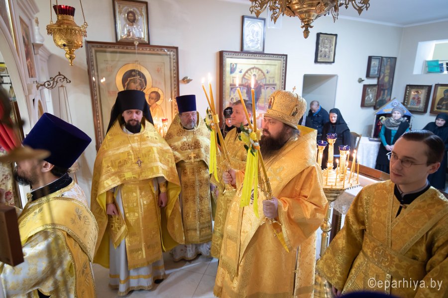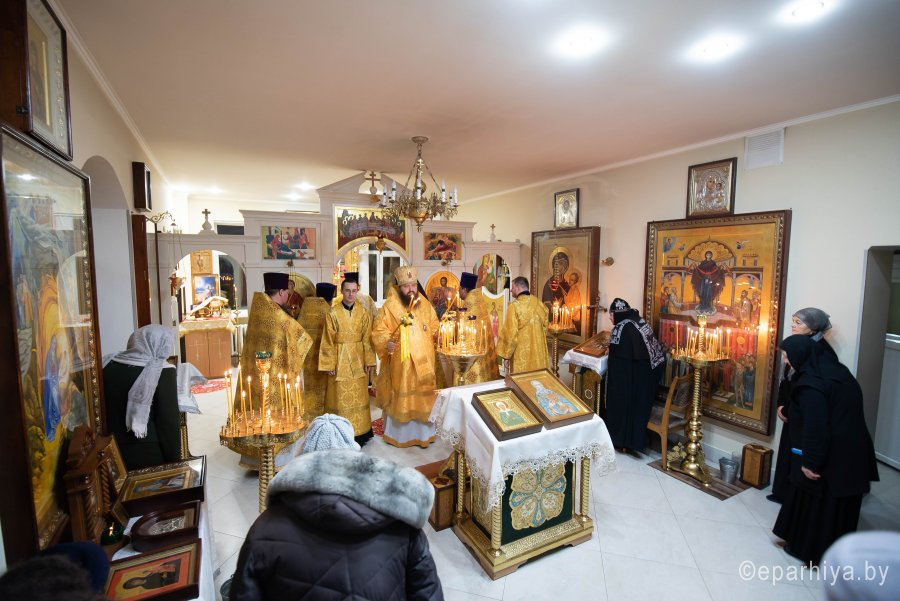 Божественную литургию в четверг 29-й седмицы по Пятидесятнице 2 января 2020г. в Тихвинском монастыре г.Гомеля совершили Высокопреосвященнейший Стефан архиепископ Гомельский и Жлобинский и епископ Светлогорский Амвросий, викарий Гомельской епархии в сослужении духовенства монастыря. За богослужением молились настоятельница обители игуменья Вера (Афонькина) с сестрами. По окончании богослужения Владыка поздравил причастников с принятием Святых Христовых Таин, обратился к молящимся со словами Архипастырского назидания и в память об этом дне раздал всем присутствующим иконки. |