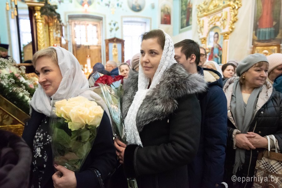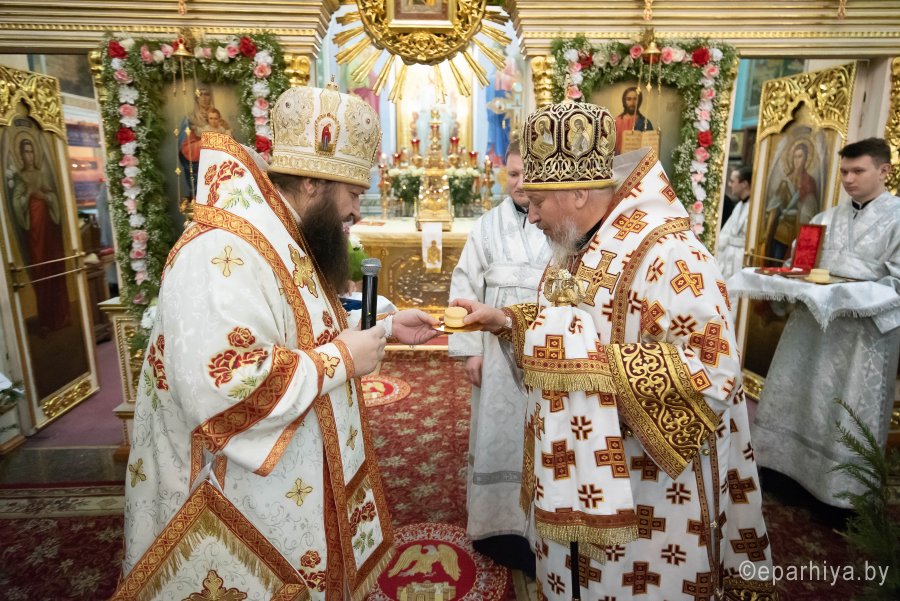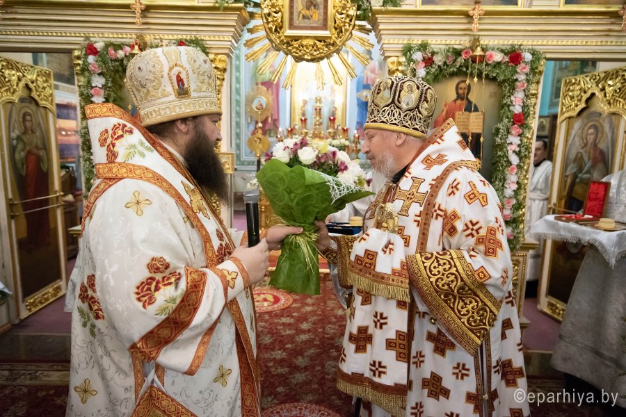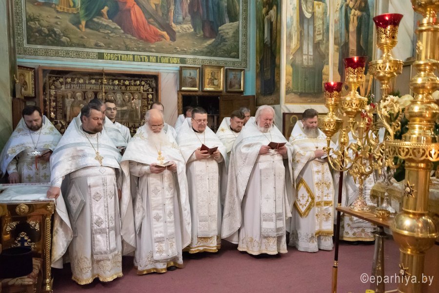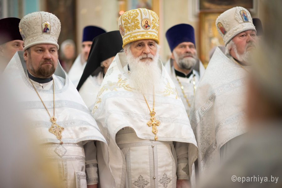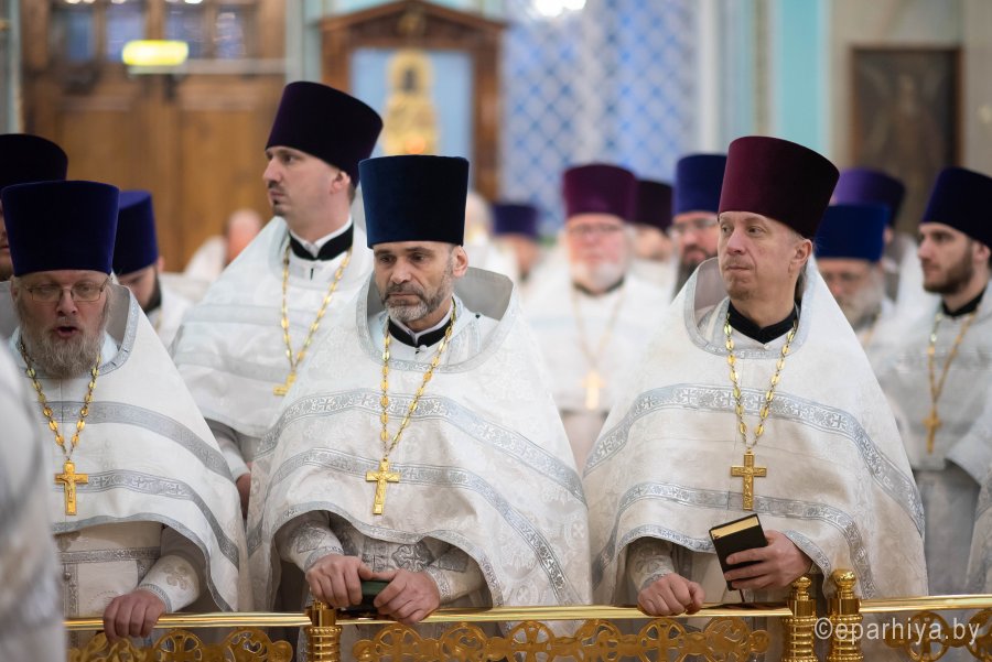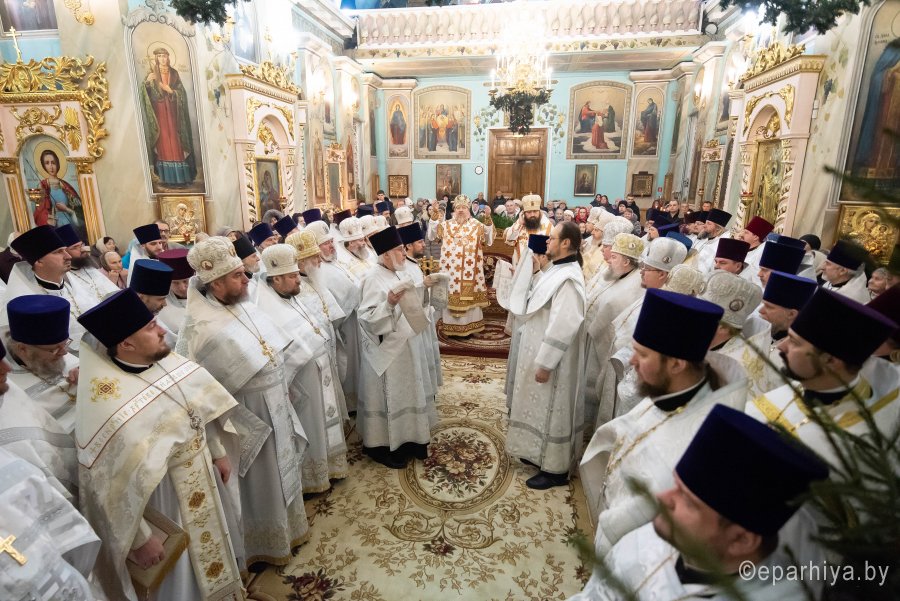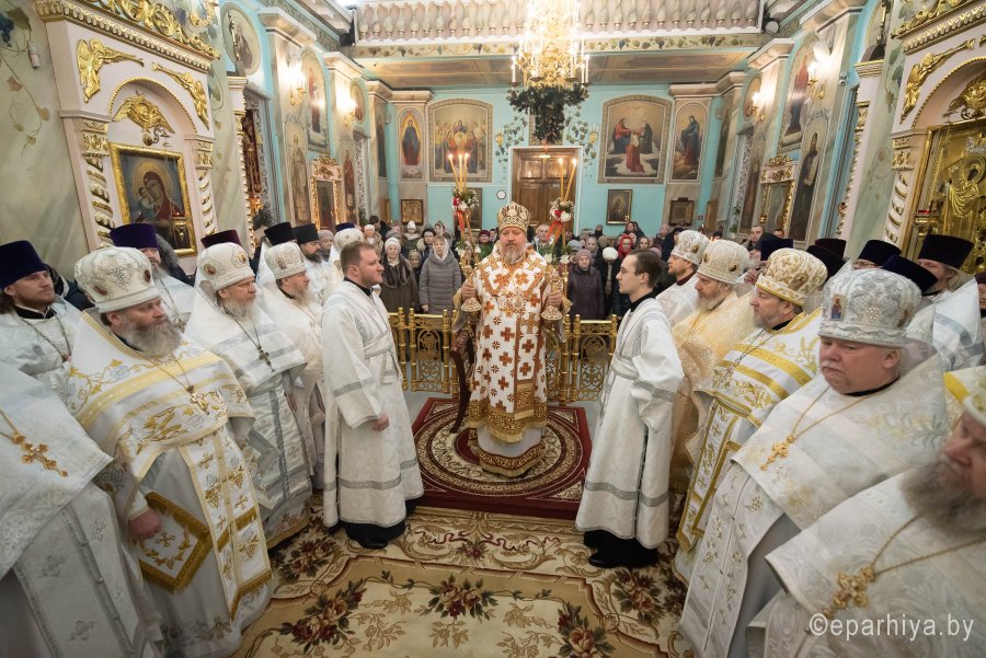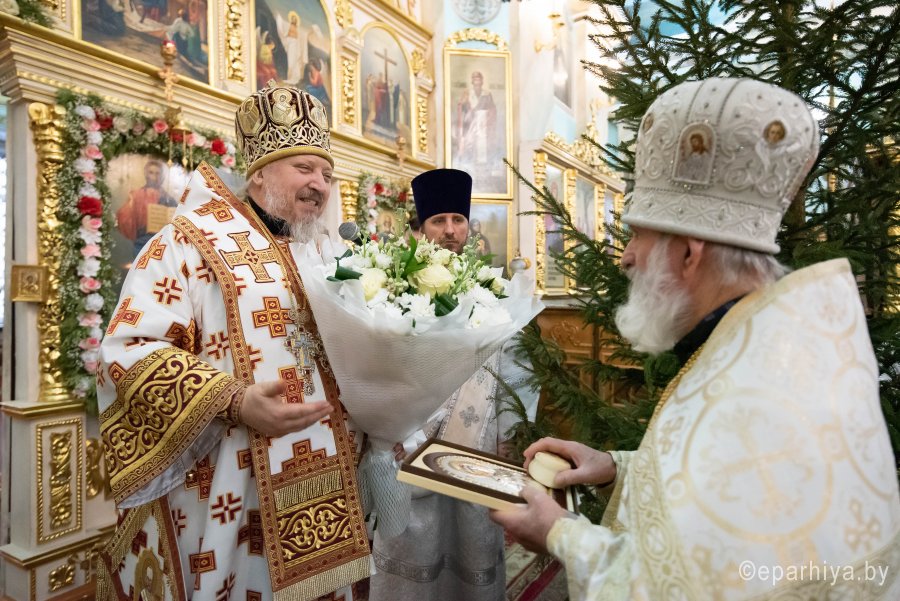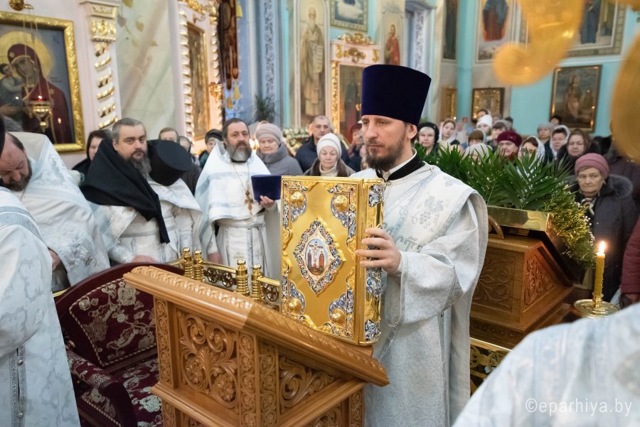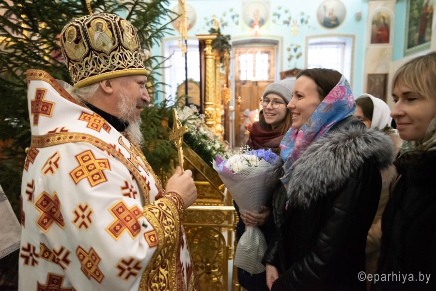 В Петро-Павловском кафедральном соборе г.Гомеля 9 января 2020г. прошли торжества, посвященные дню памяти ап. первомч. и архидиакона Стефана. В день своего тезоименитства Высокопреосвященнейший Стефан возглавил Божественную литургию в сослужении епископа Светлогорского Амвросия, викария Гомельской епархии, секретаря Гомельской епархии протоиерея Георгия Алампиева, духовника Гомельской епархии протоиерея Стефана Гладыщука, благочинных округов Гомельской епархии, Председателей епархиальных отделов, настоятелей храмов и духовенства епархии. Проповедь по запричастном стихе произнес клирик Петро-Павловского кафедрального собора г. Гомеля иеромонах Аристарх (Дроздов). За богослужением молились игуменьи монастырей Гомельской епархии: Иоанна (Ярец) с сестрами Свято-Успенского женского монастыря д. Казимирово, Вера (Афонькина) с сестрами Свято-Тихвинского женского монастыря г.Гомеля и старшая монахиня Архелая (Новикова) с сестрами Иоанно-Кормянского женского монастыря. За богослужением были вознесены молитвы о мире в Украине. От лица духовенства епархии Высокопреосвященнейшего Стефана с Днем Ангела поздравил Владыка Амвросий, пожелав ему помощи Божией и покрова Царицы Небесной в служении на ниве Христовой. Владыка Стефан сердечно поблагодарил всех за поздравления и общую молитву, и в свою очередь поздравил духовника Гомельской епархии протоиерея Стефана Гладыщука с Днем Ангела и преподнес в дар святую просфору и букет цветов. По окончании богослужения было совершено славление празднику и пропето величание первомученику и архидиакону Стефану. |