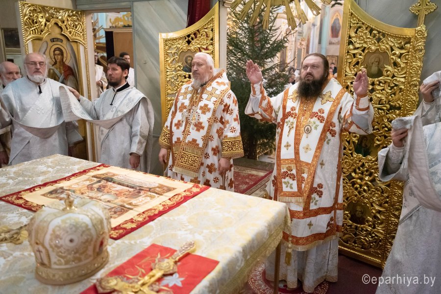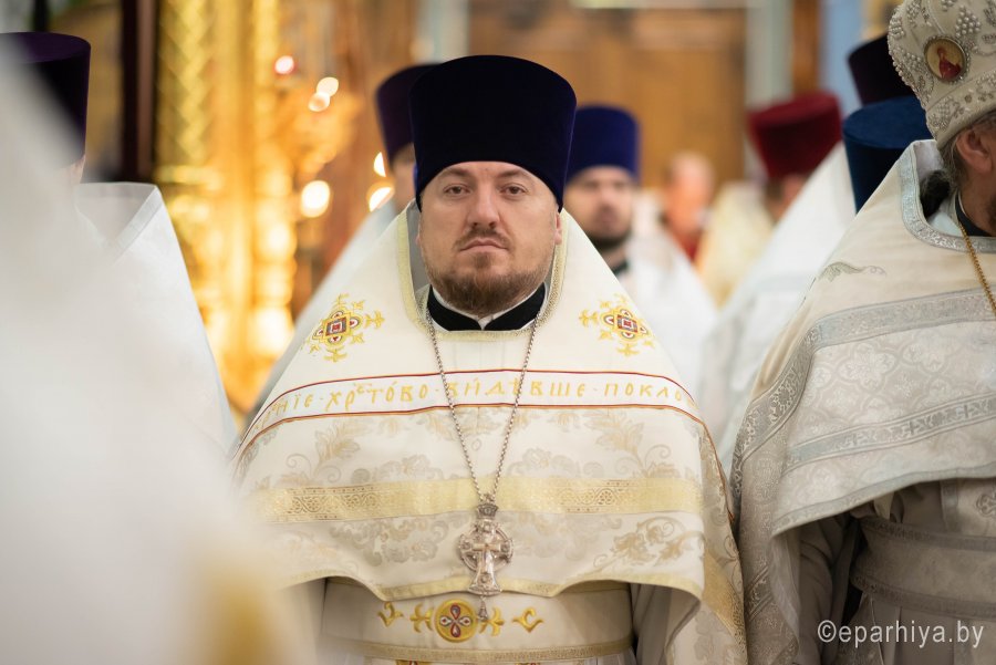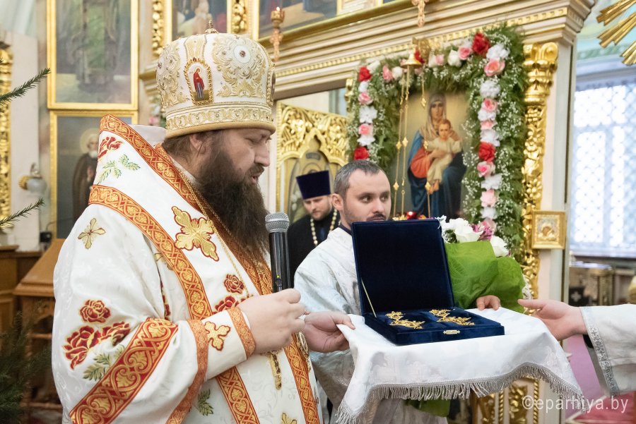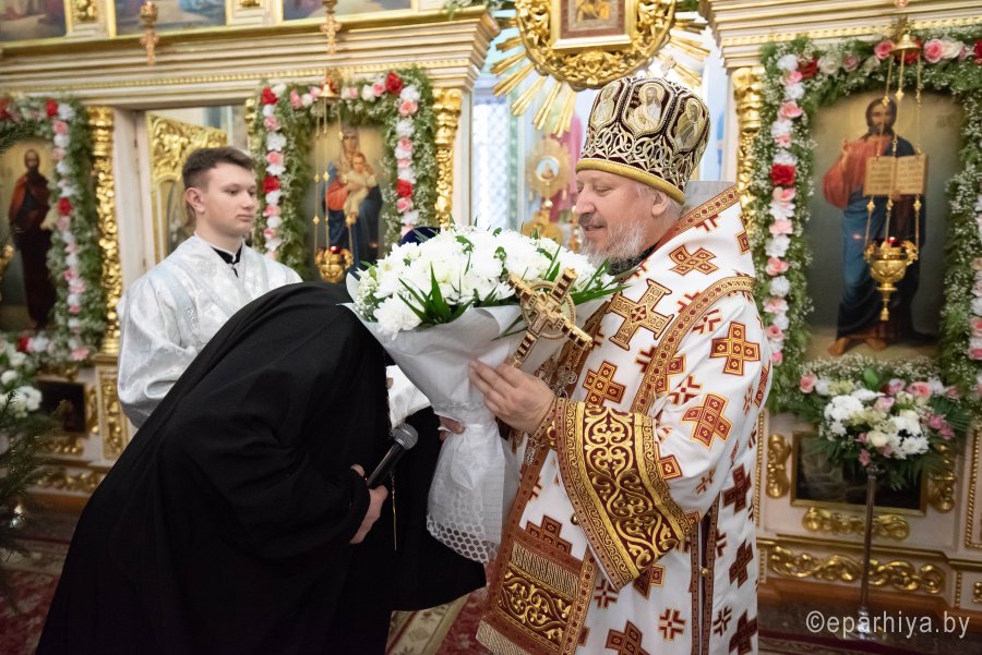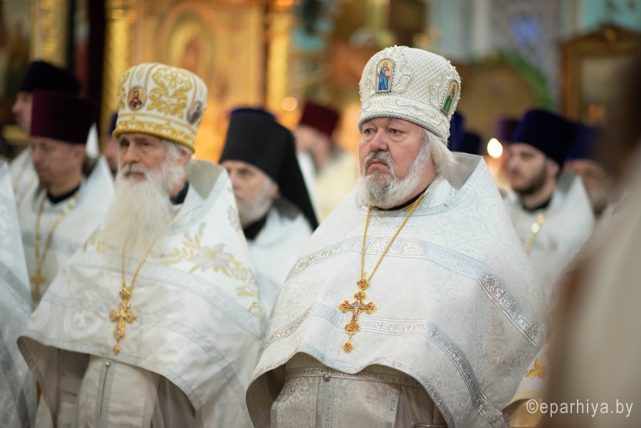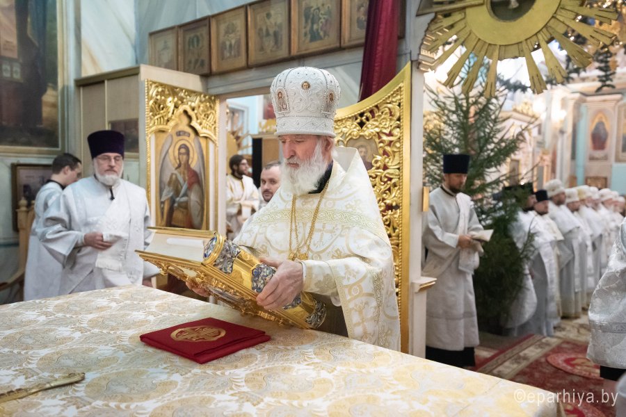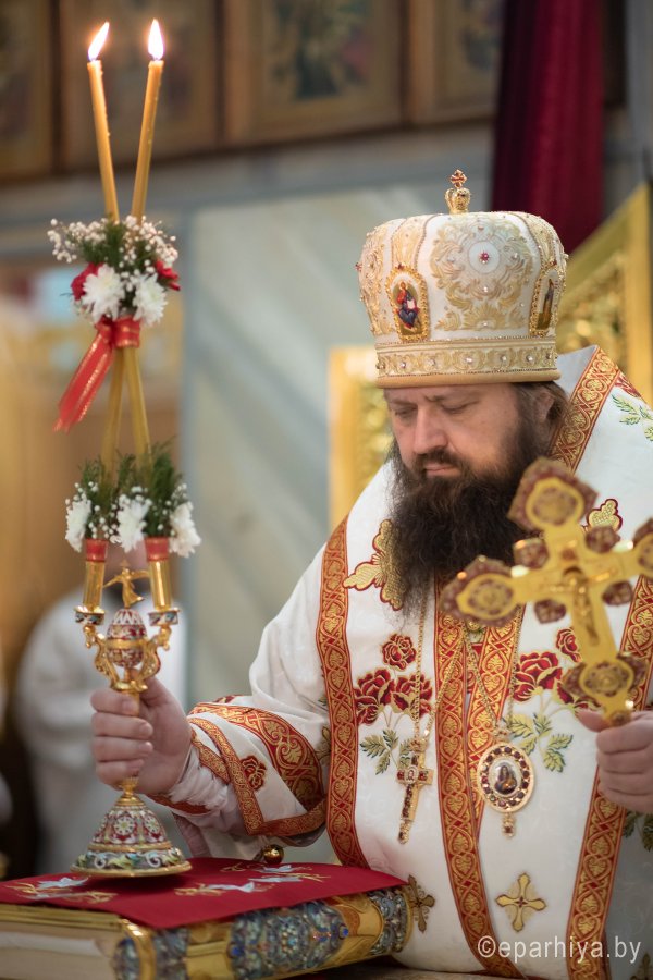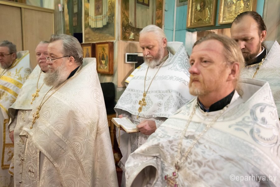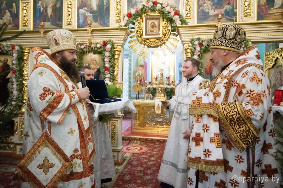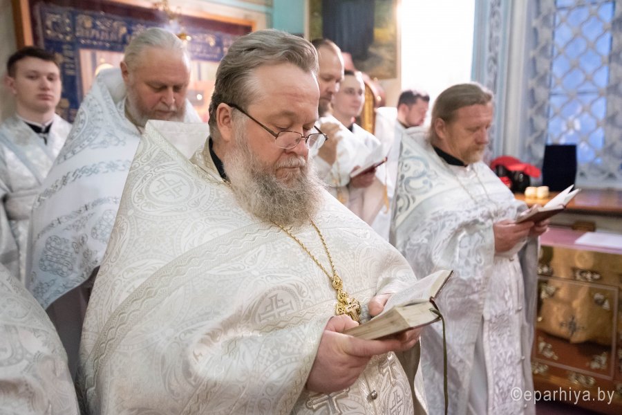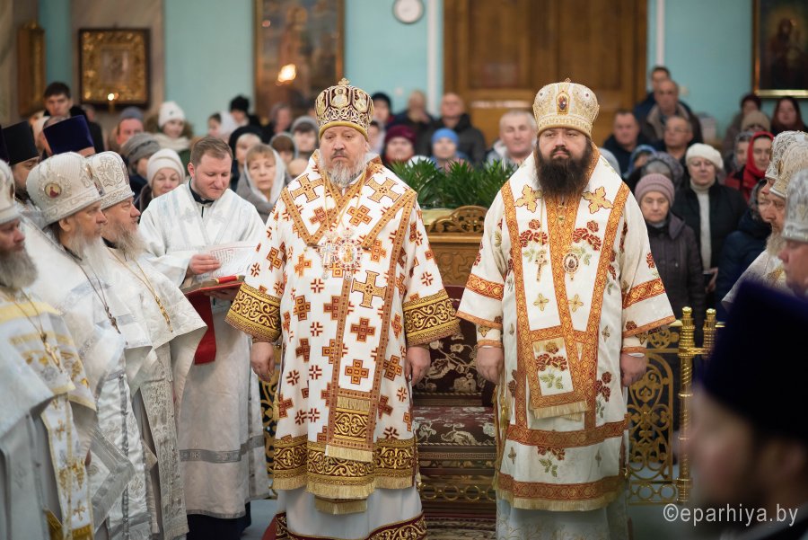 В Петро-Павловском кафедральном соборе г.Гомеля 9 января 2020г. прошли торжества, посвященные дню памяти ап. первомч. и архидиакона Стефана. В день своего тезоименитства Высокопреосвященнейший Стефан возглавил Божественную литургию в сослужении епископа Светлогорского Амвросия, викария Гомельской епархии, секретаря Гомельской епархии протоиерея Георгия Алампиева, духовника Гомельской епархии протоиерея Стефана Гладыщука, благочинных округов Гомельской епархии, Председателей епархиальных отделов, настоятелей храмов и духовенства епархии. Проповедь по запричастном стихе произнес клирик Петро-Павловского кафедрального собора г. Гомеля иеромонах Аристарх (Дроздов). За богослужением молились игуменьи монастырей Гомельской епархии: Иоанна (Ярец) с сестрами Свято-Успенского женского монастыря д. Казимирово, Вера (Афонькина) с сестрами Свято-Тихвинского женского монастыря г.Гомеля и старшая монахиня Архелая (Новикова) с сестрами Иоанно-Кормянского женского монастыря. За богослужением были вознесены молитвы о мире в Украине. От лица духовенства епархии Высокопреосвященнейшего Стефана с Днем Ангела поздравил Владыка Амвросий, пожелав ему помощи Божией и покрова Царицы Небесной в служении на ниве Христовой. Владыка Стефан сердечно поблагодарил всех за поздравления и общую молитву, и в свою очередь поздравил духовника Гомельской епархии протоиерея Стефана Гладыщука с Днем Ангела и преподнес в дар святую просфору и букет цветов. По окончании богослужения было совершено славление празднику и пропето величание первомученику и архидиакону Стефану. |