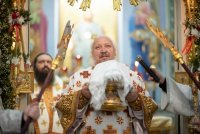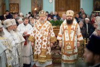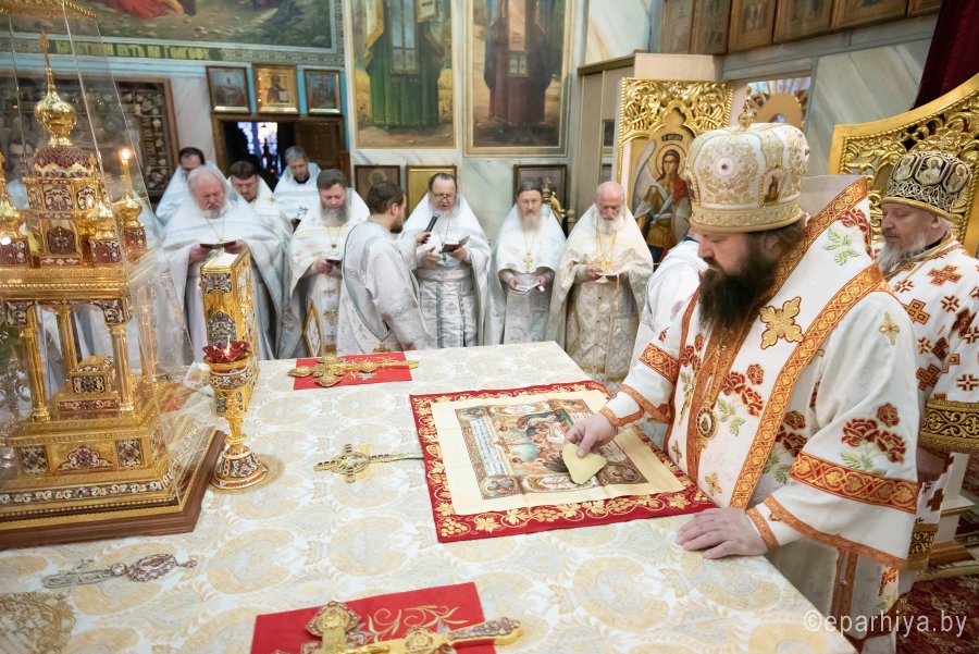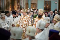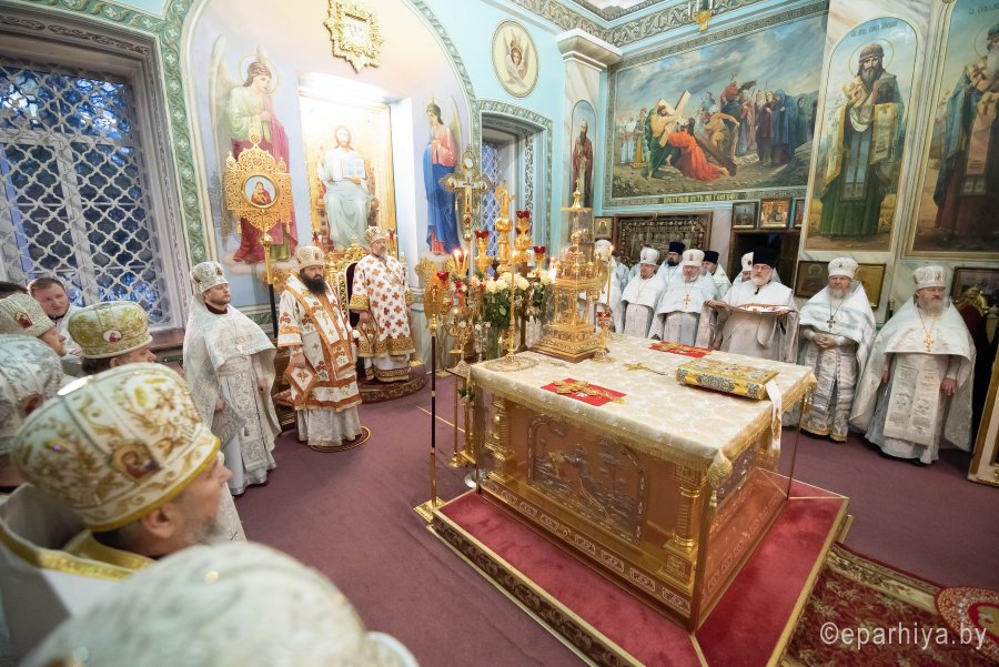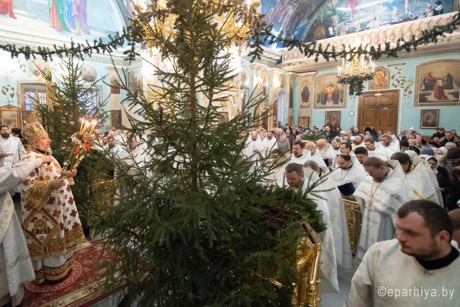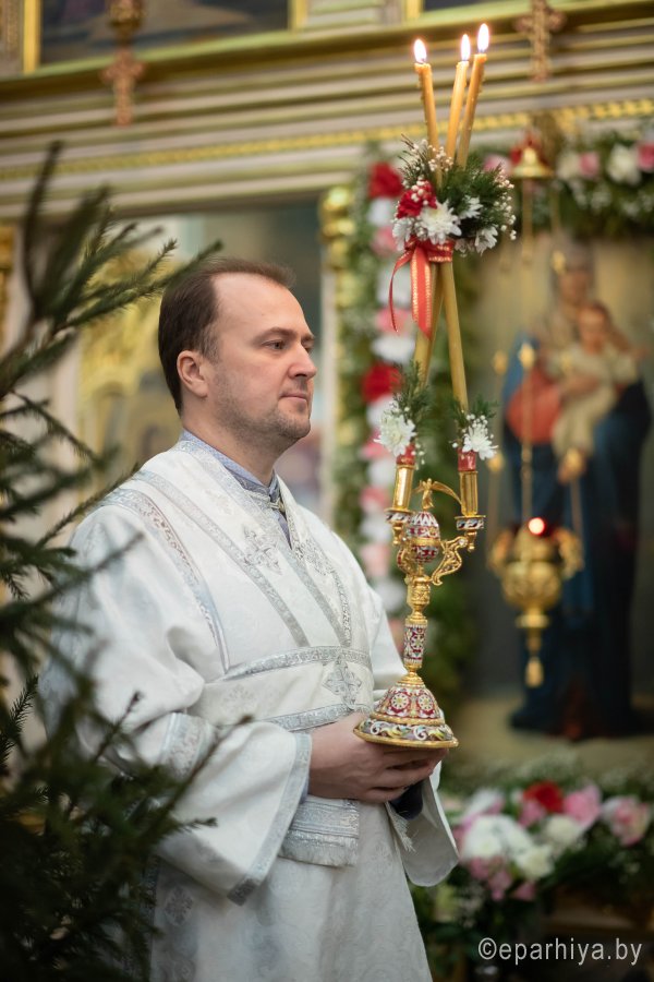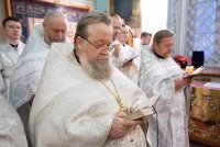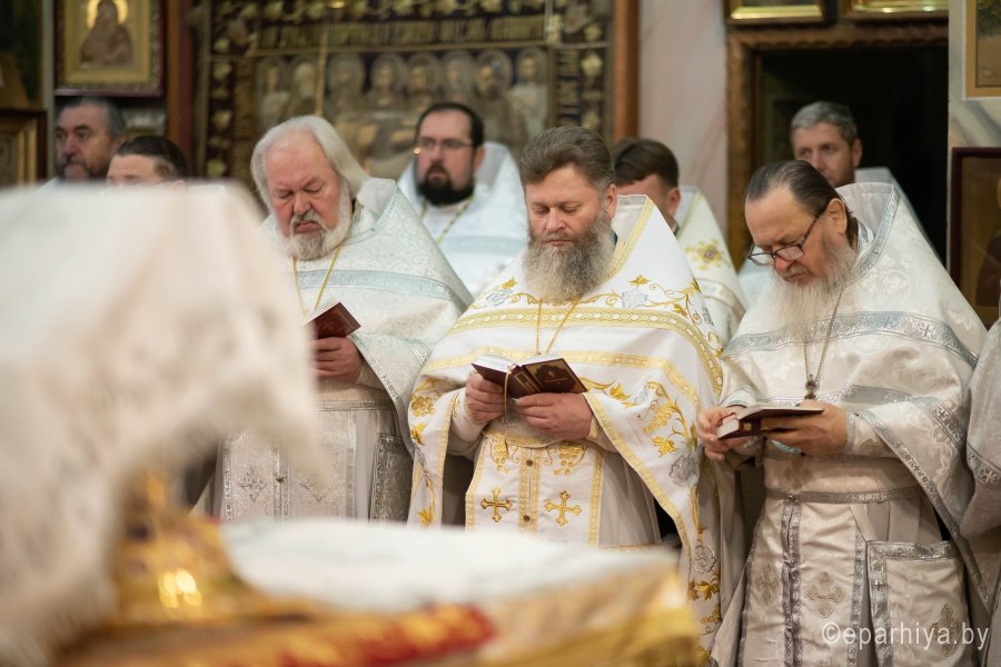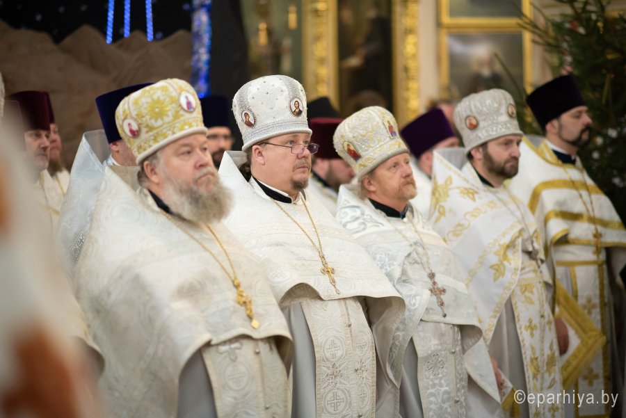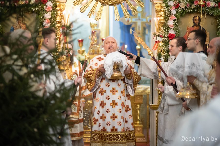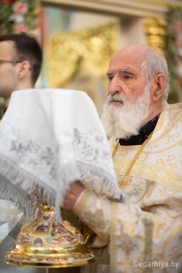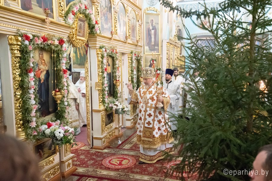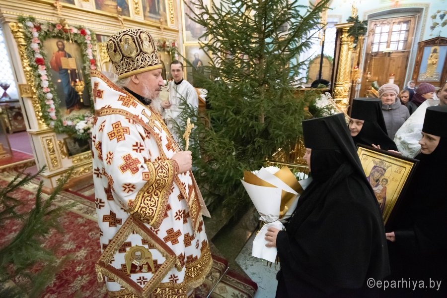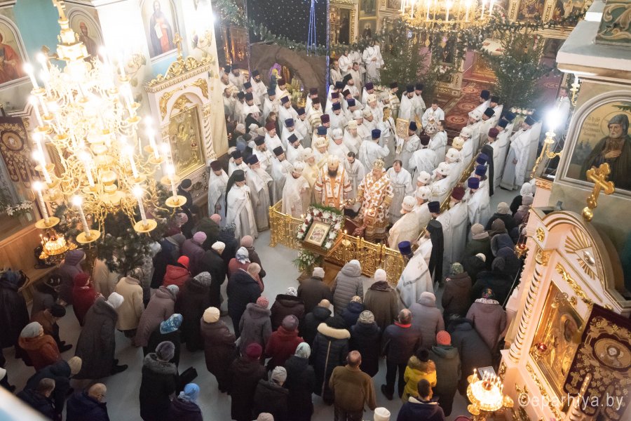 В Петро-Павловском кафедральном соборе г.Гомеля 9 января 2020г. прошли торжества, посвященные дню памяти ап. первомч. и архидиакона Стефана. В день своего тезоименитства Высокопреосвященнейший Стефан возглавил Божественную литургию в сослужении епископа Светлогорского Амвросия, викария Гомельской епархии, секретаря Гомельской епархии протоиерея Георгия Алампиева, духовника Гомельской епархии протоиерея Стефана Гладыщука, благочинных округов Гомельской епархии, Председателей епархиальных отделов, настоятелей храмов и духовенства епархии. Проповедь по запричастном стихе произнес клирик Петро-Павловского кафедрального собора г. Гомеля иеромонах Аристарх (Дроздов). За богослужением молились игуменьи монастырей Гомельской епархии: Иоанна (Ярец) с сестрами Свято-Успенского женского монастыря д. Казимирово, Вера (Афонькина) с сестрами Свято-Тихвинского женского монастыря г.Гомеля и старшая монахиня Архелая (Новикова) с сестрами Иоанно-Кормянского женского монастыря. За богослужением были вознесены молитвы о мире в Украине. От лица духовенства епархии Высокопреосвященнейшего Стефана с Днем Ангела поздравил Владыка Амвросий, пожелав ему помощи Божией и покрова Царицы Небесной в служении на ниве Христовой. Владыка Стефан сердечно поблагодарил всех за поздравления и общую молитву, и в свою очередь поздравил духовника Гомельской епархии протоиерея Стефана Гладыщука с Днем Ангела и преподнес в дар святую просфору и букет цветов. По окончании богослужения было совершено славление празднику и пропето величание первомученику и архидиакону Стефану. |