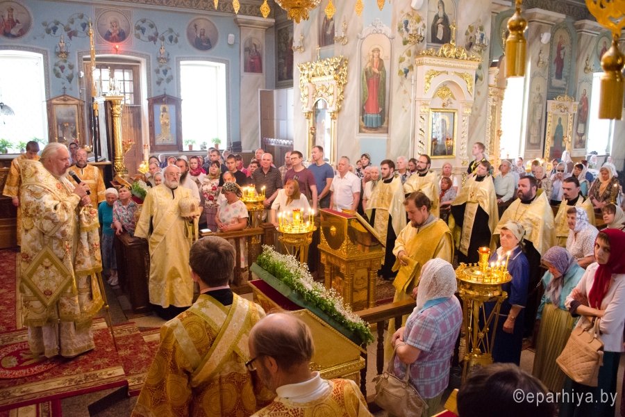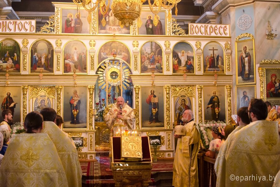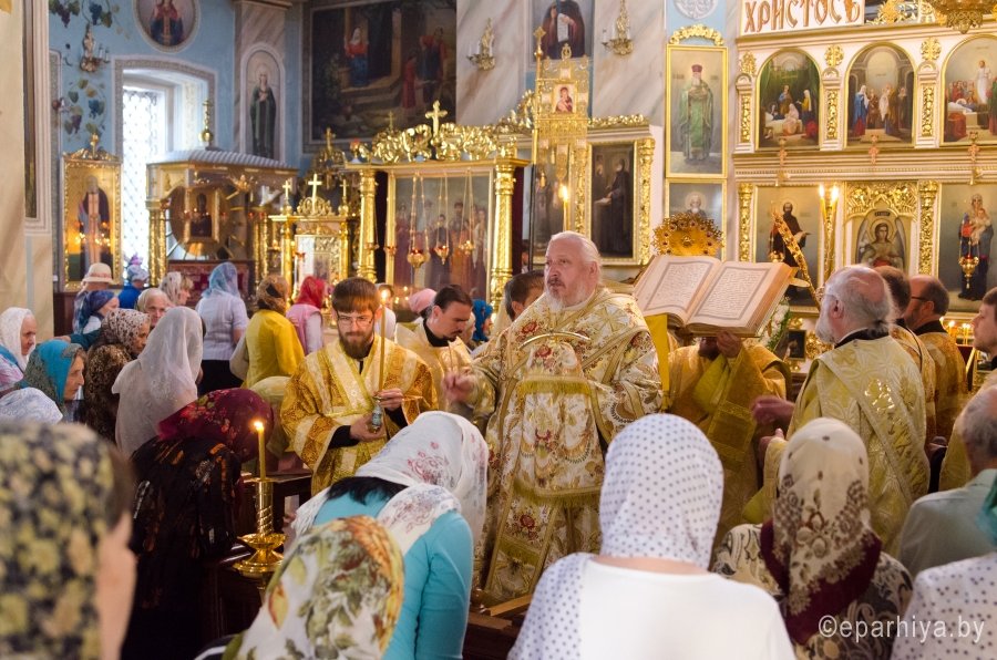 7 июня 2015г. Преосвященнейший Стефан возглавил вечернее богослужение с пением акафиста Пресвятой Богородице в Свято-Петро-Павловском кафедральном соборе г.Гомеля. Преосвященнейшему сослужили: секретарь Гомельской епархии протоиерей Георгий Алампиев и духовенство епархии. В завершении все молящиеся смогли вознести свои молитвы перед образом Казанской иконы Божией Матери, которой в день своего венчания Ирина Паскевич получила благословение от своих родителей. |