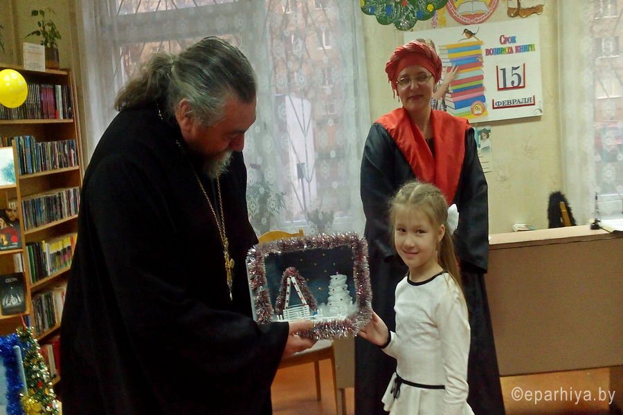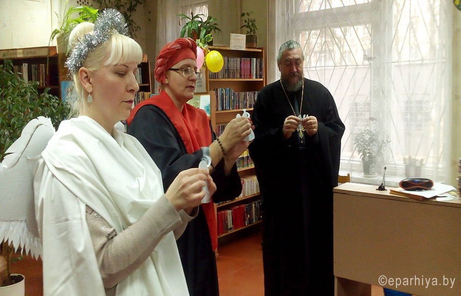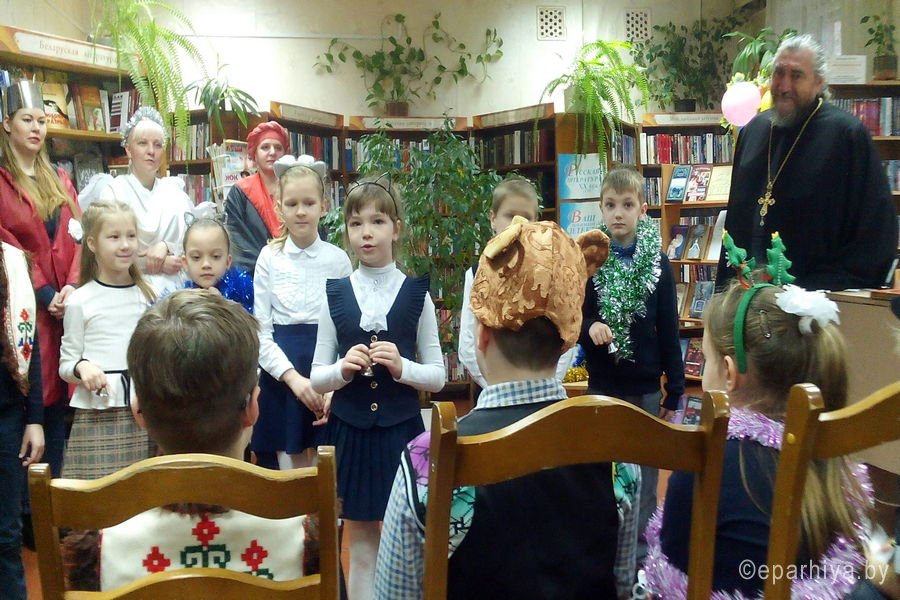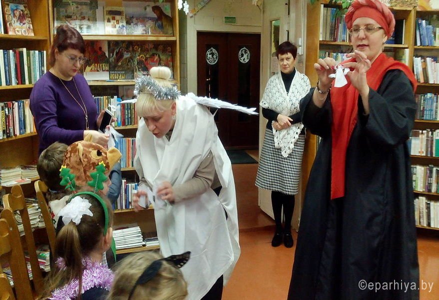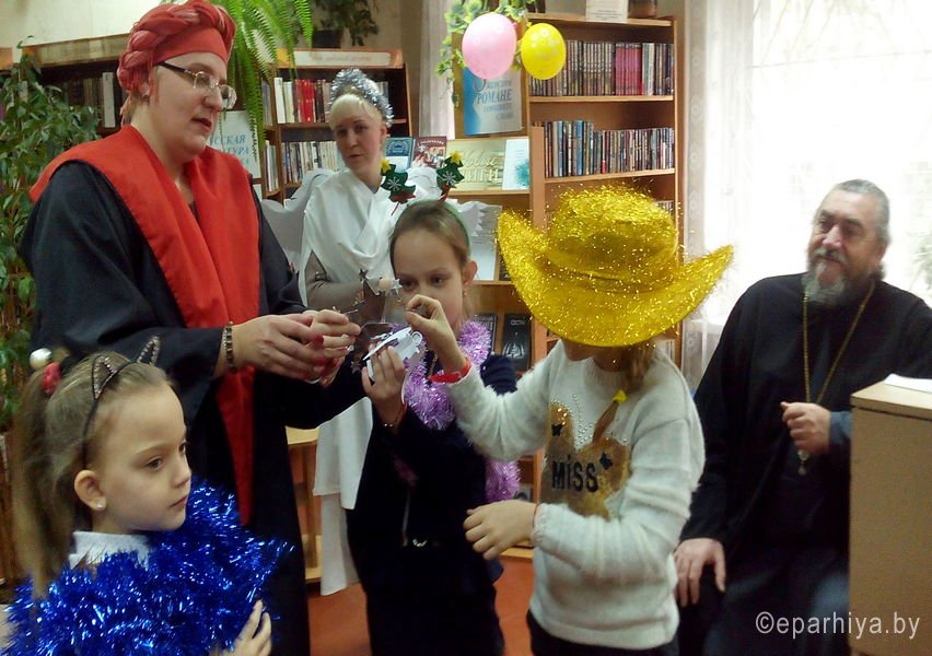 Театрализованное представление «Чудеса в рождественскую ночь» с участием настоятеля прихода храма св. блгв. кн. Александра Невского в г. Гомеле Владимира Силенко состоялось 14 января 2020 г. в библиотеке-филиале № 14 для учащихся младших классов ГУО «Средняя школа № 15 г. Гомеля». Школьники совместно с героями сказок: Звездочетом-Мудрецом, Ангелом и Королём искали осколки Рождественской звезды. Праздник получился веселым. Ребята принимали участие в различных конкурсах, играх, викторинах: «Веселое хоровое пение», «Рождественские загадки», «Дары волхвов», получали праздничные телеграммы от сказочных персонажей, мастерили маленьких ангелочков, пели рождественские песни и читали стихи. Священник рассказал ребятам об истории празднования Рождества, обратил внимание детей на необходимость проявлять милосердие, доброту к тем, кто болен, немощен и стараться помочь. По окончании мероприятия ребята порадовали священника поделкой «Рождественский вечер», сделанной собственными руками, а настоятель угостил ребят сладостями. Материал предоставлен приходом храма св. блгв. кн. Александра Невского в г. Гомеле |