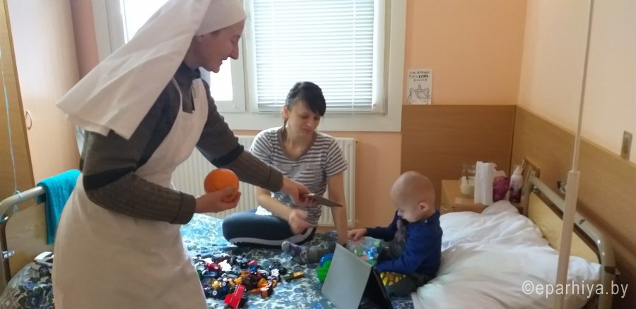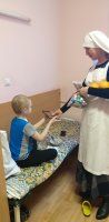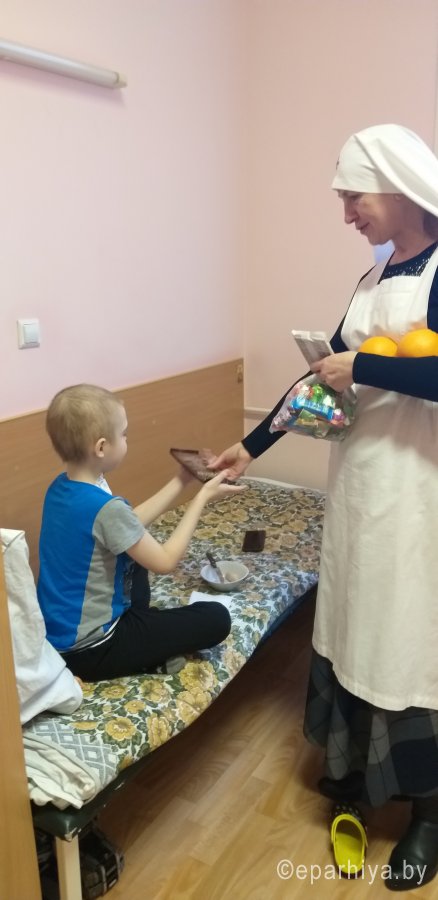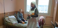 В великий праздник Светлого Христова Рождества в Республиканском центре радиационной медицины сестры сестричества во имя святой великомученицы Варвары, что при Александро-Невском храме города Гомеля, подготовились к поздравлению пациентов, тех, кто в непростой ситуации, потере здоровья, находится в больнице. По давней традиции акция, "Рождественский дар" проводится сестрами ежегодно в праздник Рождества Христова и помогает болящим ощутить радость чудесного праздника. Около 112 пациентов, находящихся на лечении в отделениях детской и взрослой гематологии, иммунопатологии, хирургии, ЧАЭС, гинекологии и офтальмологии в этот день получили сладкие подарки, апельсины и шоколадки. Выражаем слова благодарности за милосердие и помощь нашим благотворителям Кирьяновым Александру и Наталье, а также Инне, Сергию, Константину и Сергию, без помощи которых это поздравление не смогло бы состояться. |