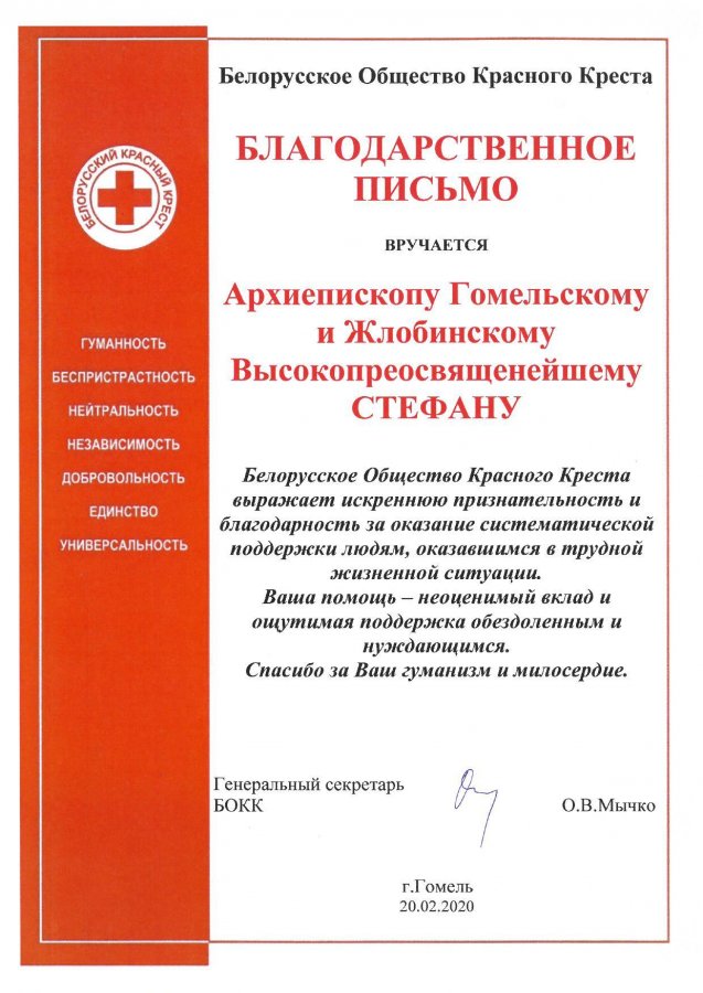 Высокопреосвященнейший Стефан, архиепископ Гомельский и Жлобинский, 20 февраля 2020 года принял участие в заседании Президиума Гомельской областной организации Белорусского Общества Красного Креста, которое состоялось в малом зале Гомельского областного исполнительного комитета. Во время заседания были озвучены основные показатели деятельности и подведены итоги работы за 2019 год, намечены планы и определена стратегия деятельности на 2020 год. Архиепископу Гомельскому и Жлобинскому Стефану было вручено благодарственное письмо за оказание систематической поддержки людям, оказавшимся в трудной жизненной ситуации, за гуманизм и милосердие. В Гомельской области действует 1 296 первичных организаций Красного Креста, в состав которых входит более двухсот двух тысяч добровольцев, оказывающих бескорыстную помощь всем, кто попал в трудную жизненную ситуацию. Гомельской областной организацией Белорусского Общества Красного Креста созданы отряды быстрого реагирования на чрезвычайные ситуации, открыт кризисный центр для людей оказавшихся в сложной жизненной ситуации, регулярно оказывается помощь нуждающимся на дому в рамках проекта «Дапамога», действует уникальный проект «Няня вместо мамы», направленный на поддержку детей оставшихся без попечения родителей и находящихся на лечении в условиях стационара, работают в регионе и образовательные центры "Социальное репетиторство" для детей, находящихся в социально опасном положении, регулярно проводятся акции и мероприятия ко всем знаковым датам. |