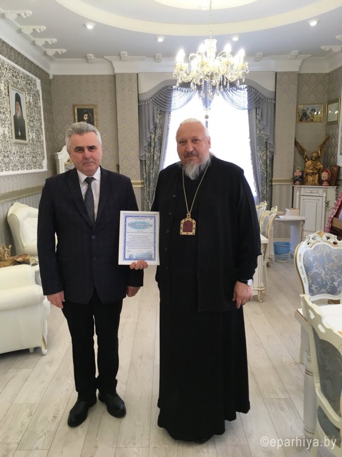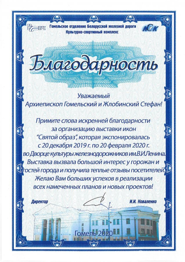 В Гомельском епархиальном управлении 20 февраля состоялась рабочая встреча архиепископа Гомельского и Жлобинского Стефана и директора культурно-спортивного комплекса Гомельского отделения Белорусской железной дороги Коваленко Ивана Ивановича. В ходе встречи обсуждались итоги выставки икон «Святой образ», которая проходила с 20 декабря 2019г. по 20 февраля 2020г. в ДК «Железнодорожников», вызвала большой интерес у горожан и гостей города и получила теплые отзывы посетителей. Коваленко Иван Иванович высказал слова признательности и вручил Владыке Стефану благодарность за организацию выставки, в свою очередь Владыка поздравил Ивана Ивановича с Днем рождения, пожелав ему помощи Божией во всех начинаниях и преподнес ему в дар святой Образ. |