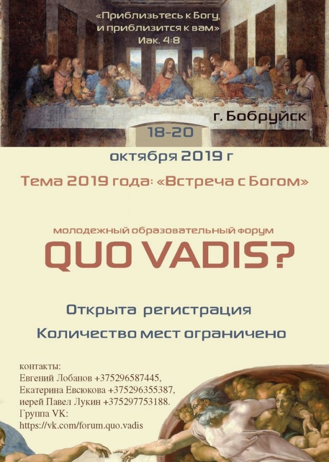 18-20 октября 2019 года в г.Бобруйске пройдет IX Международный молодежный образовательный форум “Quo Vadis?” Тема форума 2019 года: «Встреча с Богом» – «Приблизьтесь к Богу, и приблизится к вам» (Иак. 4:8)