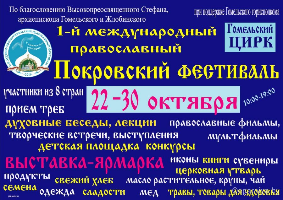 По благословению Высокопреосвященнейшего Стефана, архиепископа Гомельского и Жлобинского с 22 по 30 октября в г. Гомеле состоится 1-й Международный духовно-просветительский православный фестиваль, который откроет свои двери в здании Гомельского государственного цирка.Целью фестиваля является возрождение и сохранение духовных ценностей, укрепление межкультурных и духовных связей, а также нравственное и духовное воспитание подрастающего поколения.