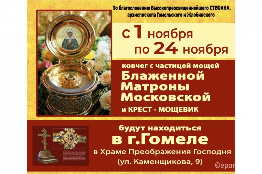 1 ноября 2019г. в Преображенский храм г.Гомеля по благословению Высокопреосвященнейшего Стефана, архиепископа Гомельского и Жлобинского, будут доставлены частица Ризы Господней в кресте-мощевике и ковчег с мощами святой блаженной старицы Матроны Московской.Доступ к святыням будет организован с 8:00 до 20:00 ежедневно по 24 ноября. Регулярно будут совершаться молебны и акафисты.