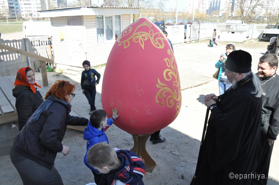 11 апреля, в Великую Субботу, Преосвященнейший Стефан епископ Гомельский и Жлобинский традиционно посетил храмы г. Гомеля.Начал объезд храмов Преосвященнейший с храма Преображения Господня г.Гомеля. Владыка освятил куличи, пасхи и крашеные яйца, благословил прихожан и благословил начало акции, которая проходит в Пасхальные дни в Приходе храма. Акция заключается в том, что каждый желающий ребенок может оставить отпечаток своей ладошки на большом расписном пасхальном яйце.