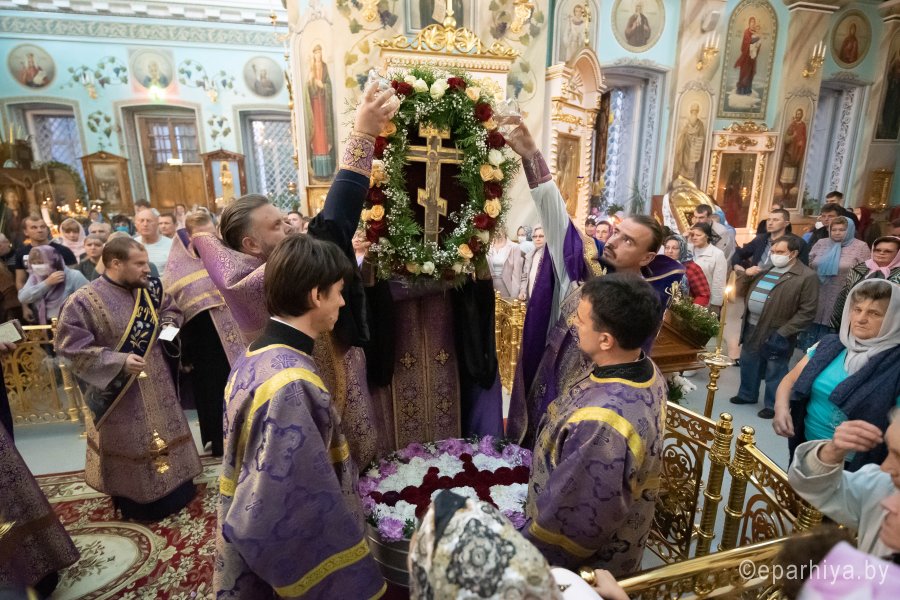 По благословению Высокопреосвященнейшего Стефана, архиепископа Гомельского и Жлобинского, Божественную литургию в праздник Воздвижения Честного и Животворящего Креста Господня 27 сентября 2020г. в Петро-Павловском кафедральном соборе г.Гомеля возглавил протоиерей Вадим Лапицкий в сослужении духовенства собора.За богослужением были вознесены сугубые молитвы о белорусском народе и об избавлении от вредоносного поветрия.