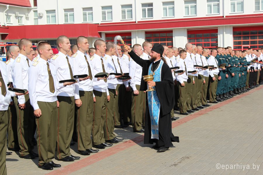 С напутственным словом к молодому пополнению обратился клирик храма святого Архангела Михаила в г. Гомеле иерей Станислав Смоляк и по традиции окропил Святой водой личный состав факультета и приглашенных гостей.