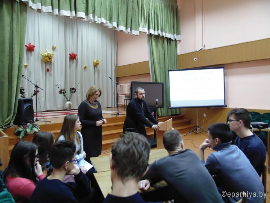 Молодежный гимназический форум - традиционная весенняя встреча старшеклассников городских школ, посвященная в этом году вопросам духовности - состоялся 28 марта 2018 года на базе ГУО "Гимназия г. Добруша". Провести форум пригласили ответственного за катехизацию в благочинии иерея Алексея Мирофанова.Эпиграфом встречи стало выступление десятиклассницы из гимназии Комиссаровой Ани - участницы детской секции районных Свято-Покровских Чтений 2017 года. Она представила свое исследование "Во что верит современная молодежь?" После чего была организована работа всех собравшихся участников встречи.