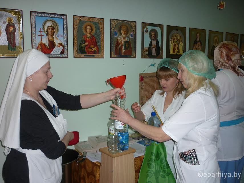 19 января 2016 года на праздник Крещения Господня сестрами сестричества во имя святой великомученицы Варвары была организована раздача крещенской воды пациентам и персоналу в молельной комнате в честь иконы Божией Матери «Всецарица» в ГУ «Республиканский научно-практический центр радиационной медицины и экологии человека» в г.Гомеле.Пациенты, с верою и надеждой пришедшие помолиться об исцелении болезней, о здравии родных и близких, а также узнать более подробно о празднике Крещения, улыбались, радуясь неожиданной счастливой возможности получить крещенскую воду, созывали своих соседей, возвращались за водой для лежачих больных, задавали много вопросов, подавали записки.