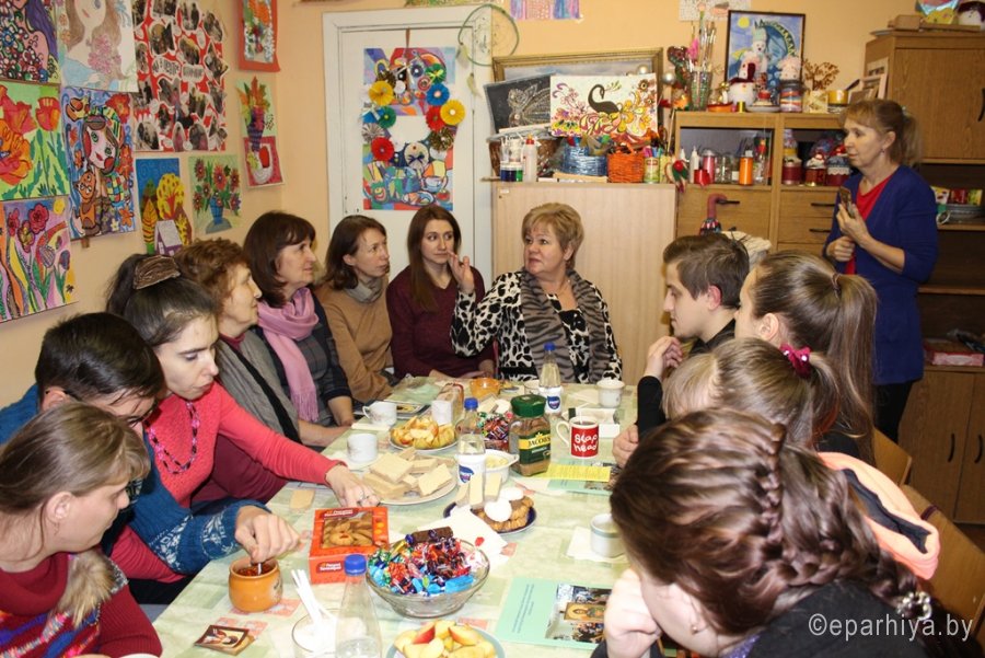 4 декабря молодёжь прихода храма святого благоверного князя Александра Невского в г.Рогачёве побывала в гостях у Рогачёвского районного общественного объединения родителей детей-инвалидов и молодых инвалидов. Вот уже 25 лет объединение помогает семьям, воспитывающим «особенных» детей, в социальной адаптации, интеграции в общество, расширяет их возможности участвовать во всех областях жизни. Дети и взрослые учатся жить с радостью: с удовольствием рукодельничают и рисуют, выезжают на природу, организовывают выставки-продажи своих работ. Объединение проводит обучающие семинары и круглые столы. С активной деятельностью и новыми проектами познакомила его руководитель Валентина Павловна Грицай. За чашкой чая в непринужденной обстановке родители «особенных» деток поделились своими радостями и трудностями. Диакон Никита Кулиткин поздравил всех с праздником Введения во храм Пресвятой Богородицы, рассказал о духовном смысле праздника и подарил иконочки. А гости вместе с хозяевами пропели ему «Многая лета» по случаю дня рождения.