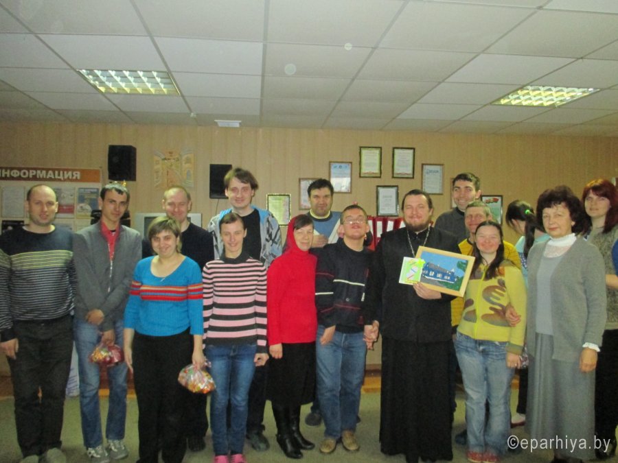 17 апреля 2017 г., с Пасхальным приветствием и поздравлениями со Светлым Христовым Воскресением отделение дневного пребывания инвалидов при территориальном центре социального обслуживания населения Жлобинского района посетили настоятель прихода храма святителя Василия Великого иерей Вячеслав Рябица и послушницы сестричества в честь иконы Божией Матери "Всецарица". Священник очередной раз напомнил ребятам о волнительных событиях Воскресения Господа, сестры милосердия вручили пасхальные подарки с куличами и яйцами. Директор ТЦСОН Крупская Наталья Владимировна поблагодарила гостей и вручила в ответ памятные подарки, сделанные руками ребят из отделения. Стоит отметить, что такие встречи воспитанников центра со служителями церкви проходят регулярно. Священослужители стараются приобщать ребят к духовной жизни, проводя беседы и экскурсии не только в праздничные дни.