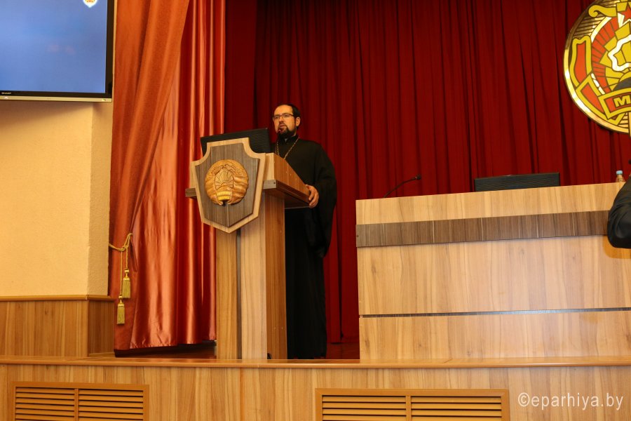 Руководитель отдела по взаимодействию с Вооруженными Силами и правоохранительными органами Гомельской епархии протоиерей Игорь Ольшанов выступил с докладом: «Духовно-нравственное воспитание молодежи как составная часть воспитания патриотизма».