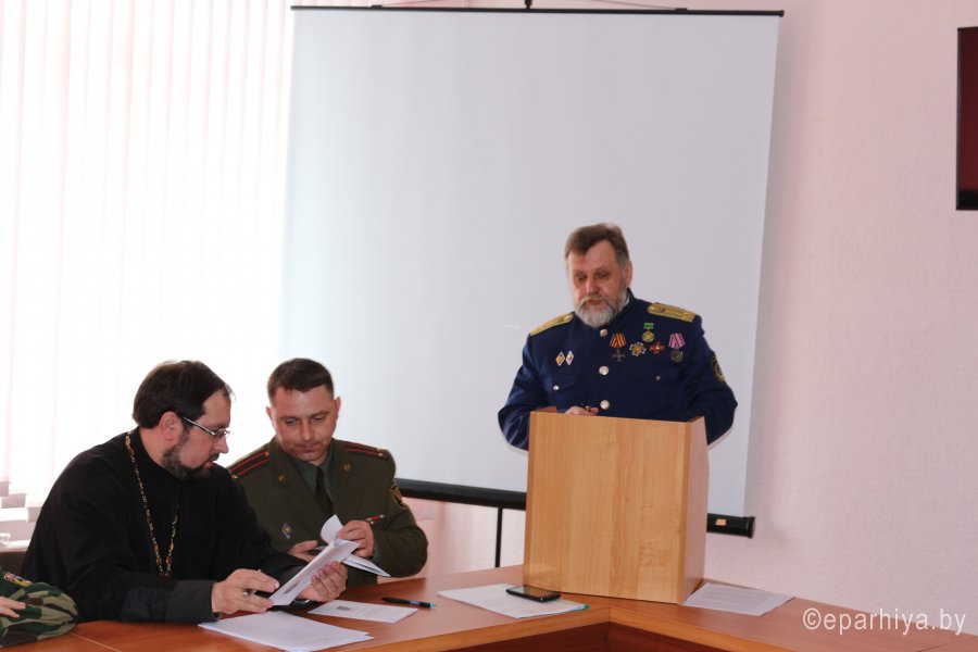 Руководитель по взаимодействию с Вооруженными силами и правоохранительными органами Гомельской епархии протоиерей Игорь Ольшанов ознакомил присутствующих с работой отдела за прошлый год, с целями и задачами работы отдела, а так же довел до присутствующих план основных мероприятий по реализации Соглашения о сотрудничестве между органами пограничной службы Республики Беларусь и Белорусской Православной Церковью на 2015 год.