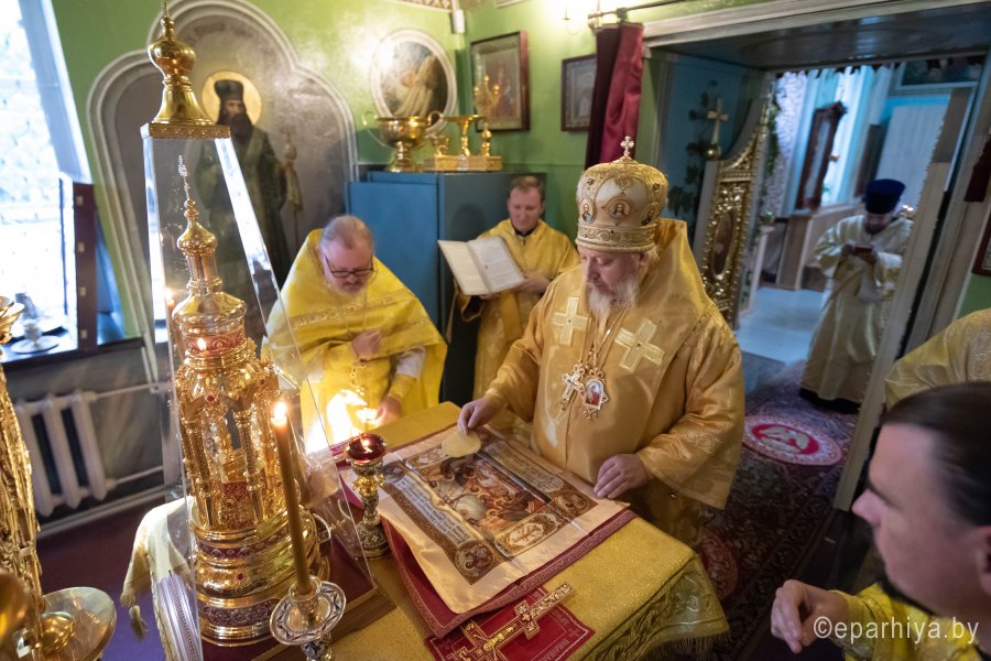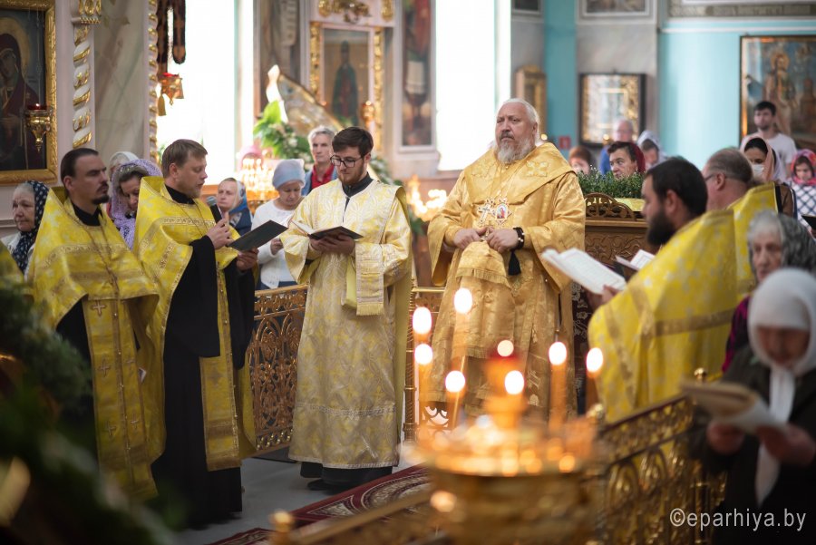 Высокопреосвященнейшему сослужили: секретарь Гомельской епархии протоиерей Георгий Алампиев, благочинный Гомельского городского округа протоиерей Игорь Ольшанов, настоятель прихода протоиерей Александр Ковалев и духовенство епархии.